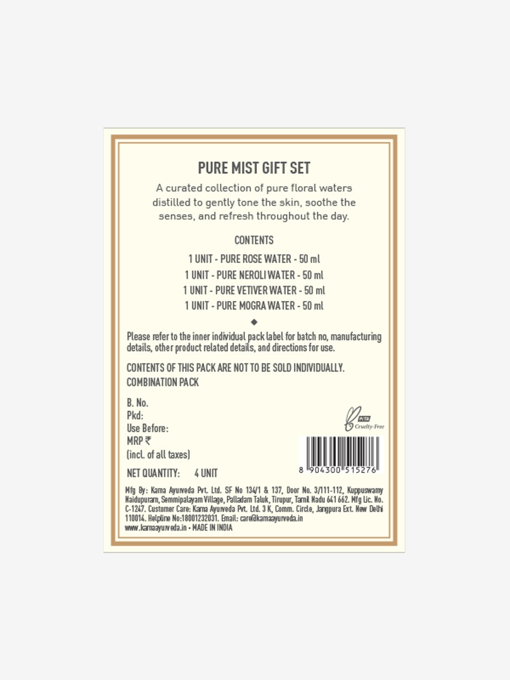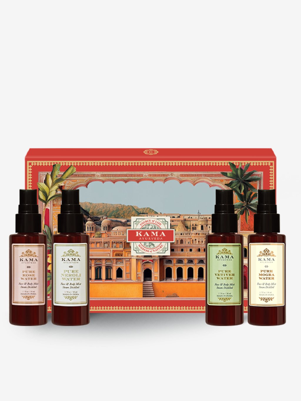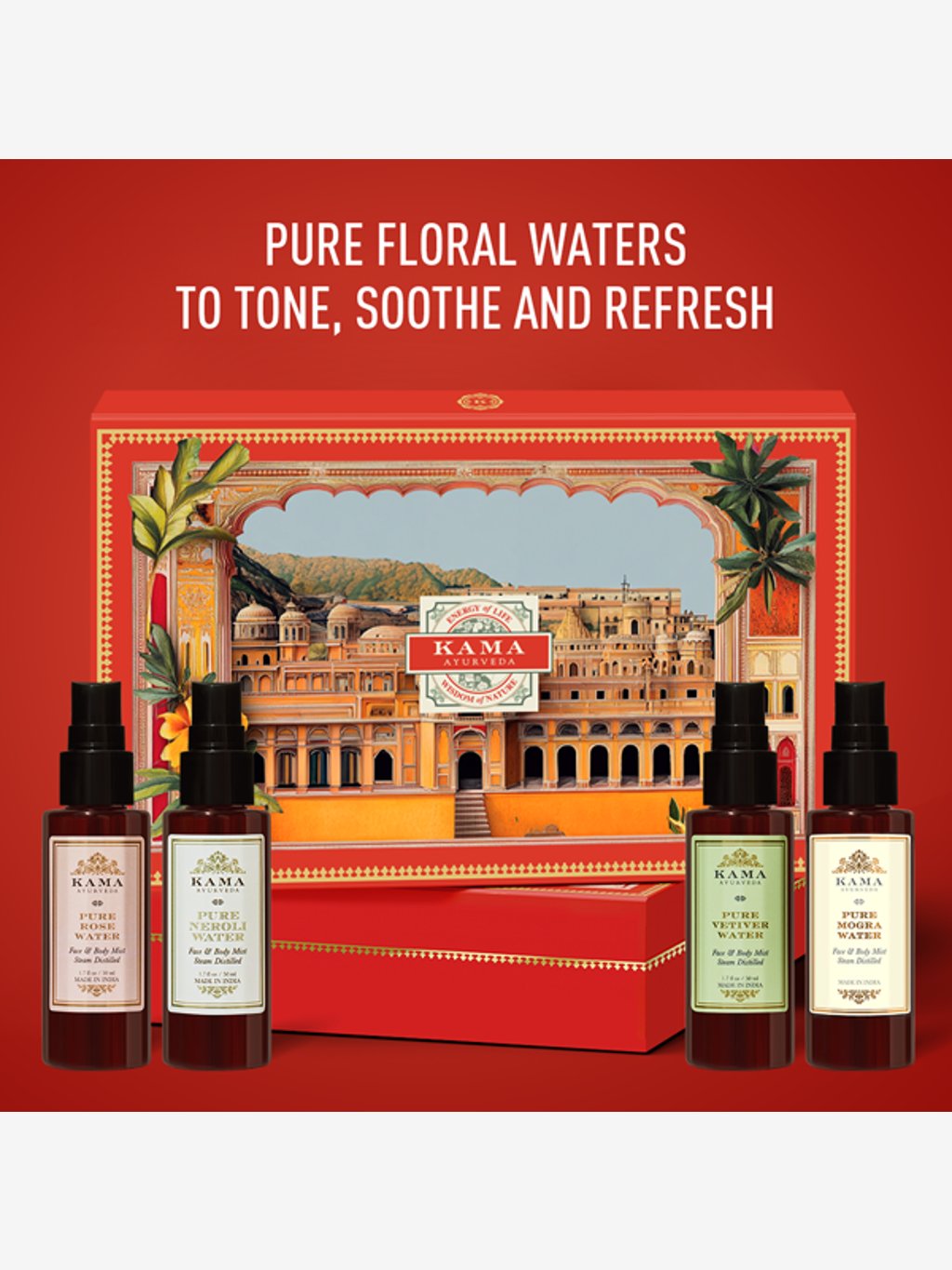 Osvěžující soubor 4 čistých květinových vod: růže, neroli, vetiver a mogra, které poskytují jemnou hydrataci, zklidňující péči a aromatický klid pro pokožku i smysly.