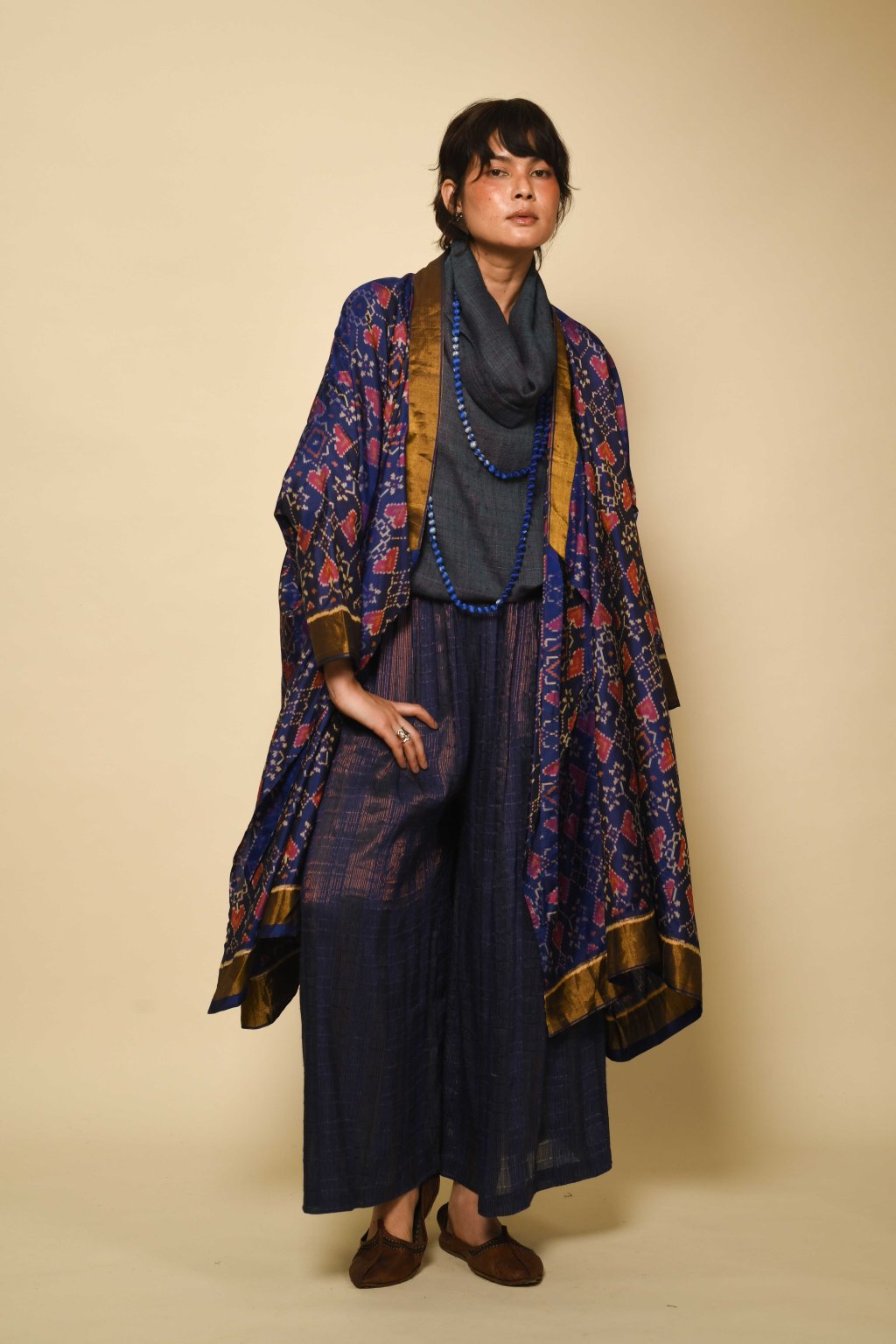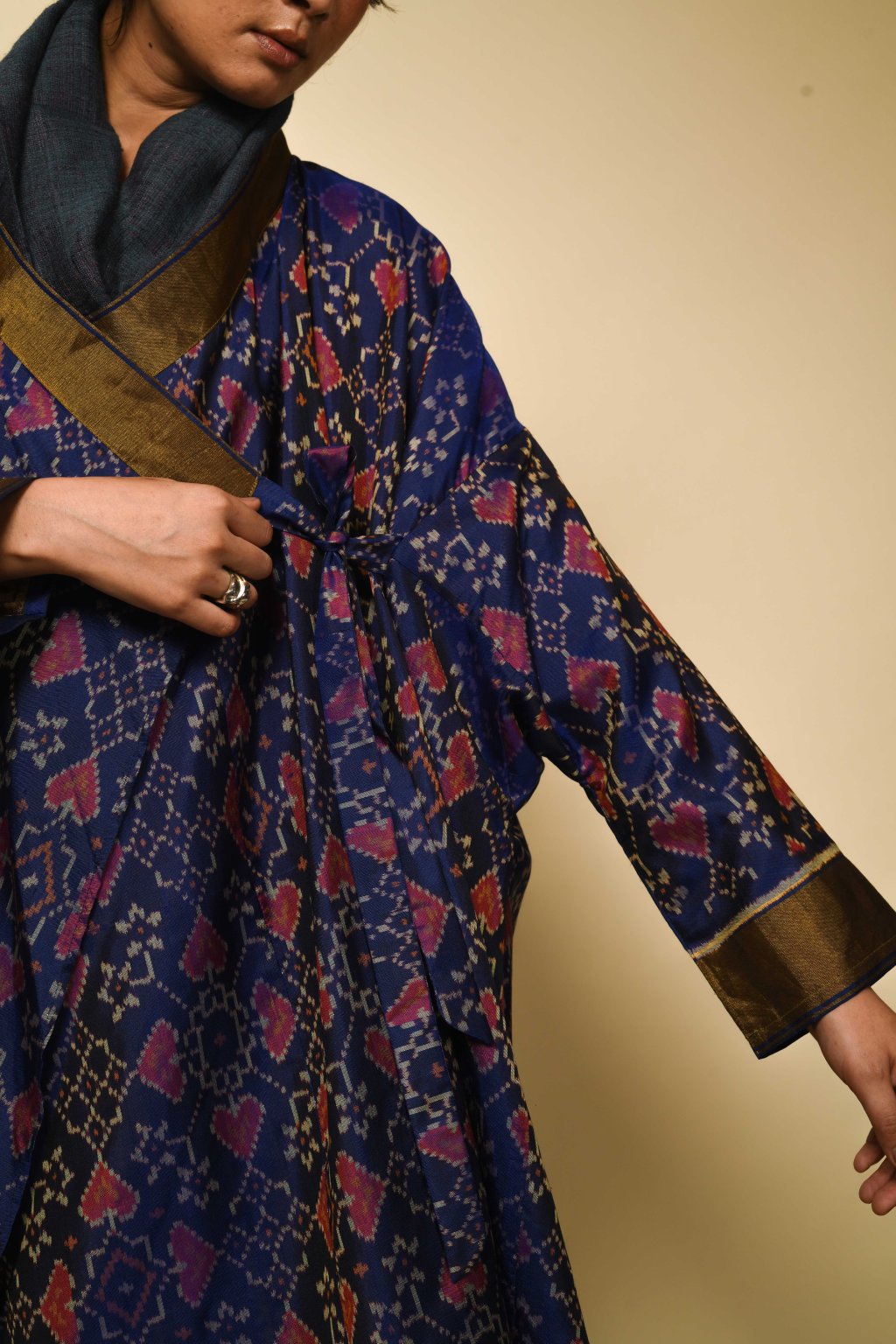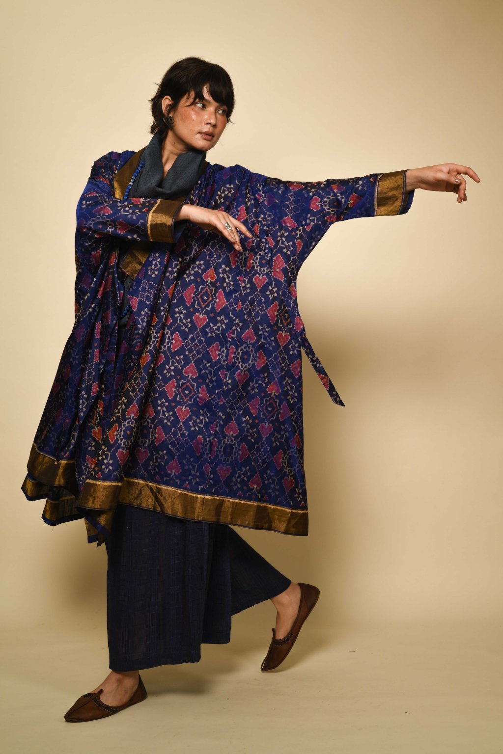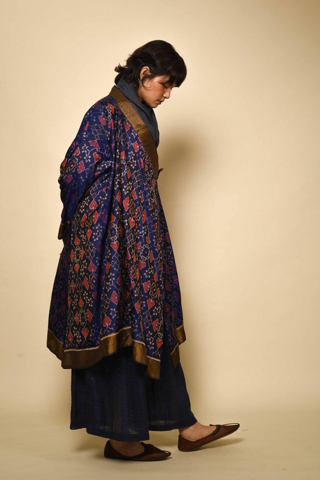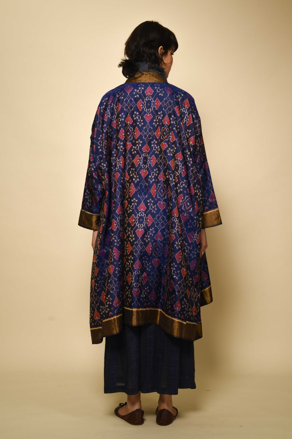 Ručně barveno a tkáno skupinou specializovaných mistrů v jednom z historických center výroby ikatu v Indii: v Hajdarábádu v oblasti Telangana. Tento region, a zejména tkalcovská městečka v okolí Počampali, je po staletí známý svými charakteristickými geometrickými ikaty a technikou telia rumal. Zmínky o tomto řemesle se objevují v místních obchodních záznamech již z období pozdního středověku. Ikat z Telangany je uznávaný pro své ostré motivy, složité sekvence rezervážního barvení a vysokou míru matematické přesnosti, která se vyžaduje od barvíře i tkalce.