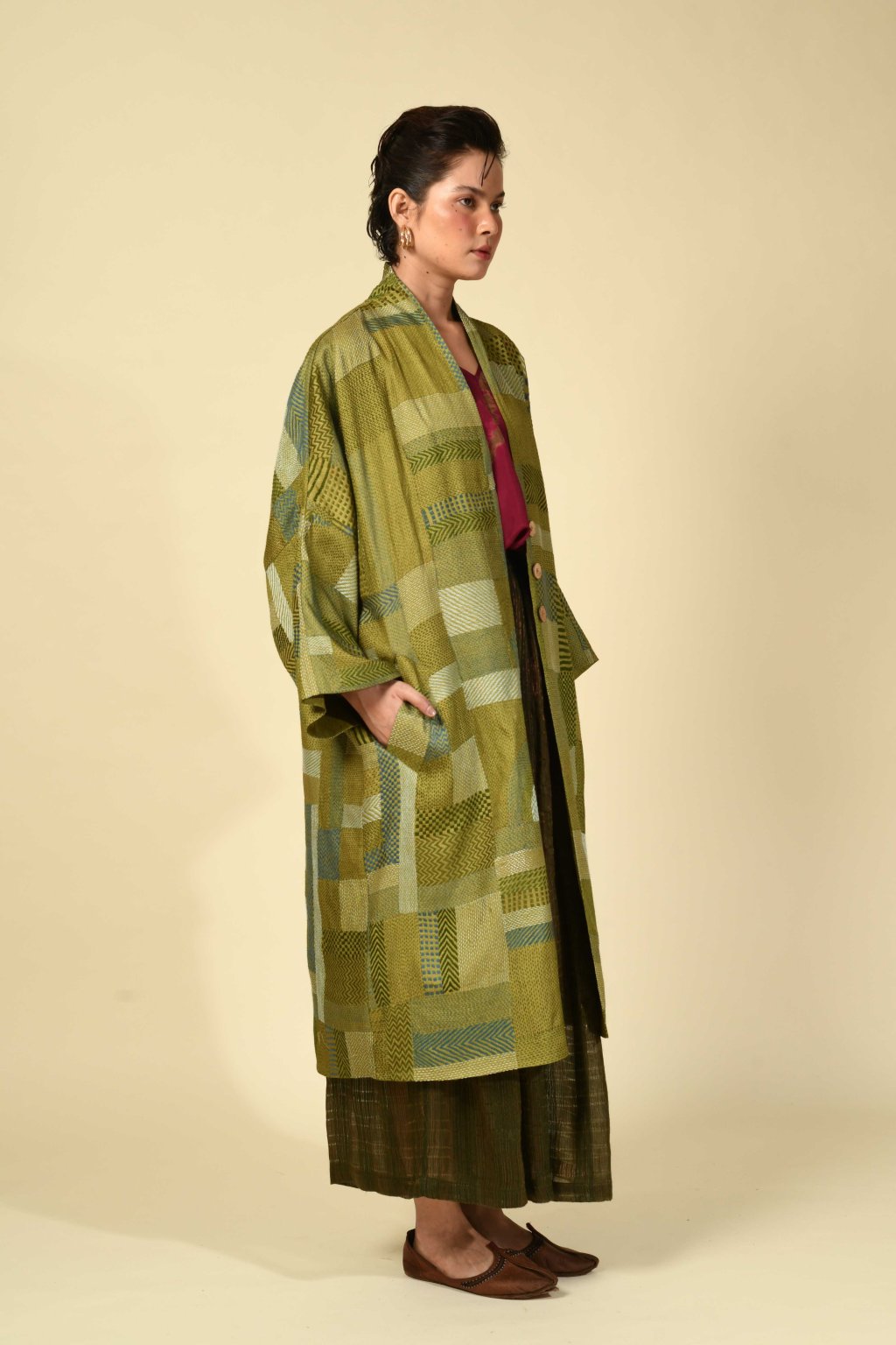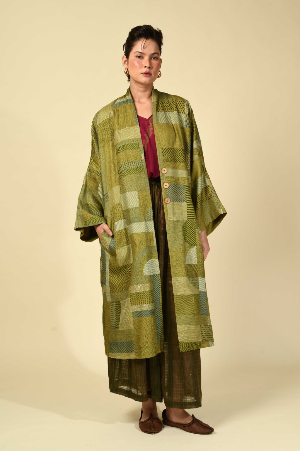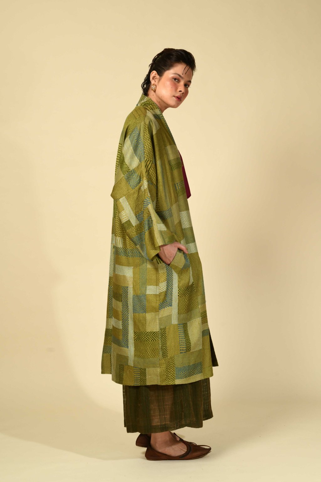 Jyaamiti Kantha dlouhý kabát z tussarového hedvábí | mehndi
