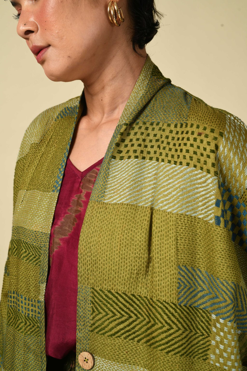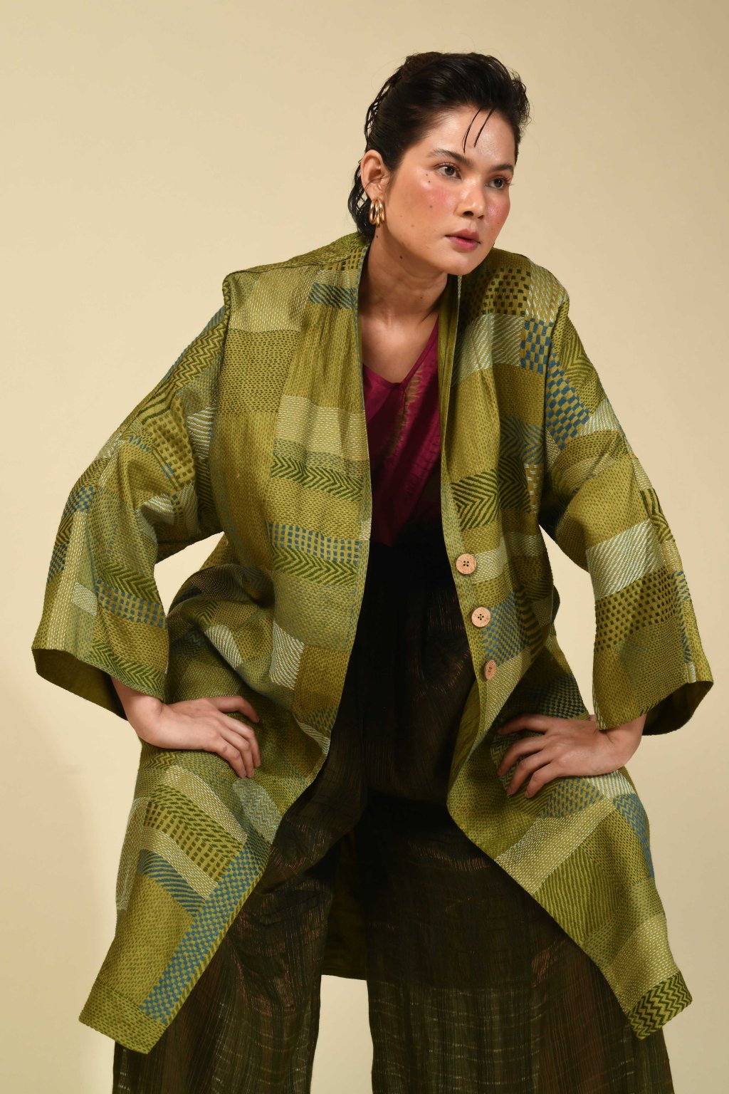 V naší kapsulové kolekci Jyaamiti Kantha dosahuje umění kantha svého absolutního vrcholu – je posunuto až na samé hranice toho, čeho dokáže lidská ruka dosáhnout. Každý kabát, ručně šitý našimi pozoruhodnými řemeslníky v Bengálsku z pravého hedvábí tussar, vzniká celých šest měsíců: je to rodinné dědictví v procesu vzniku, jehož kvalita a obětavost tvůrců jsou hodny vystavení v muzeu. Zde koexistuje přesnost s intuicí: každá linie je pečlivě odměřena, každý steh ožívá tichým rytmem lidských rukou. Napříč našimi kapsulovými kolekcemi Talisman se táhne jediná nitka: oděv jako umění, jako paměť. Každý kousek nese stopy svého tvůrce, váhu času a krásu zručnosti zdokonalované po generace.