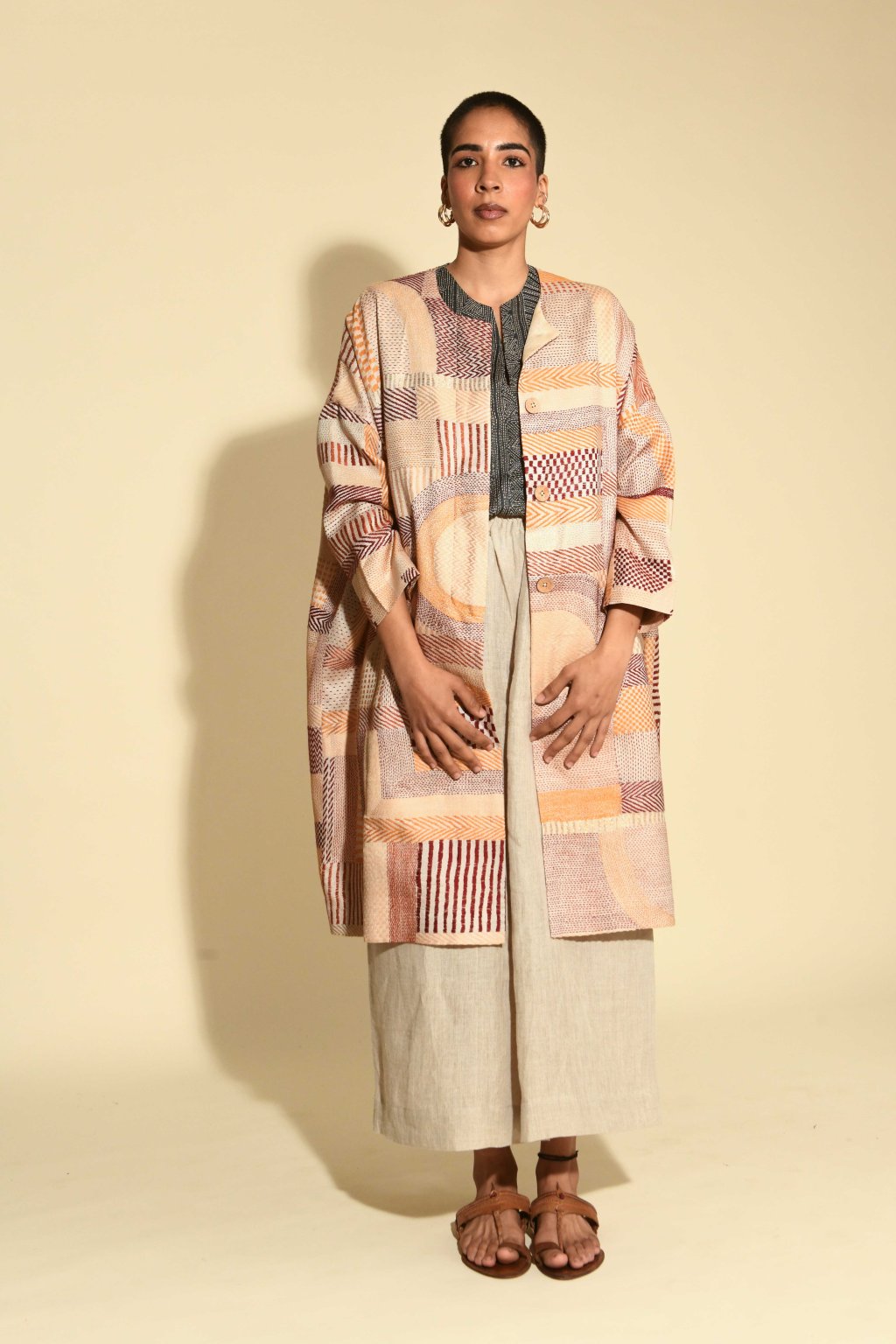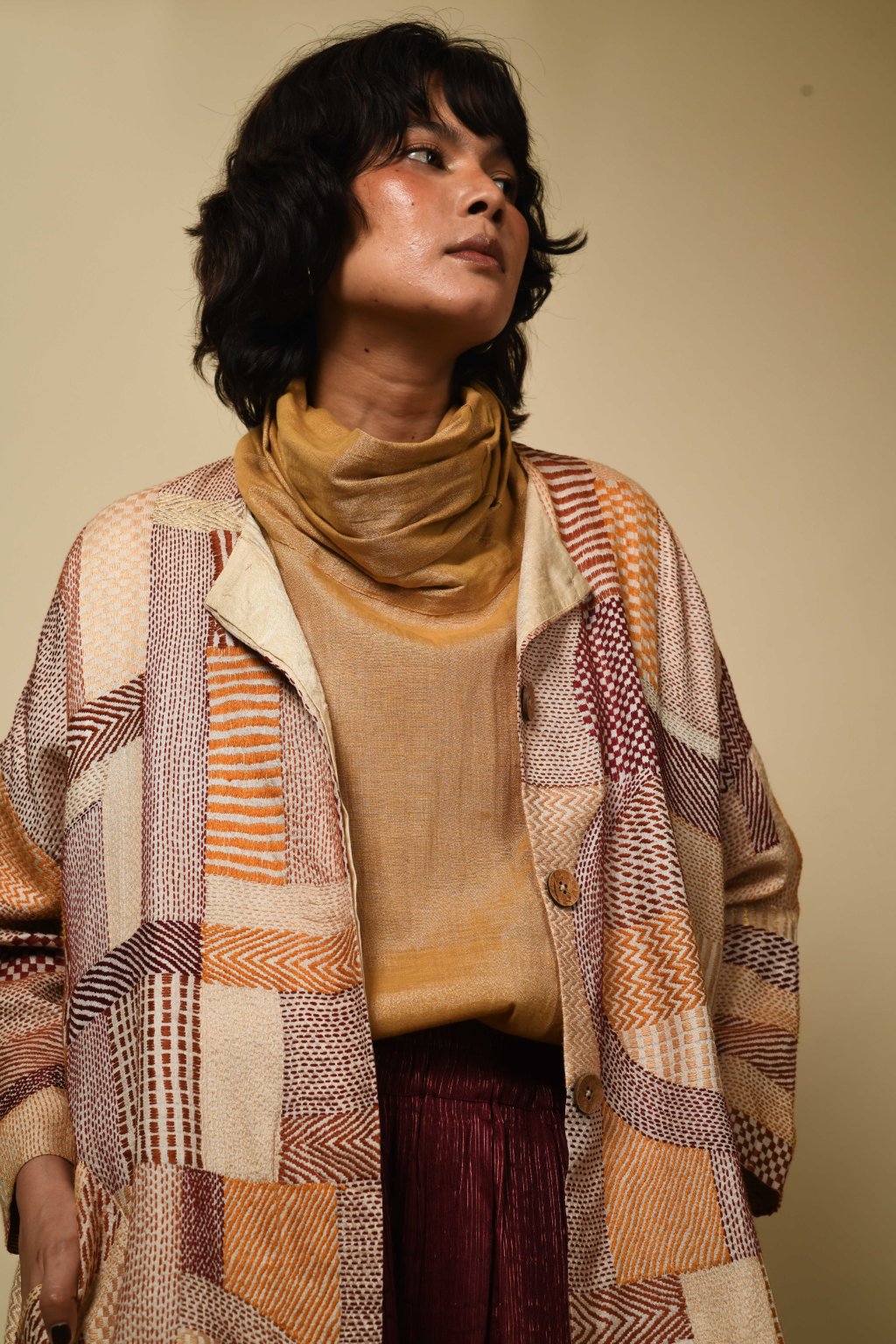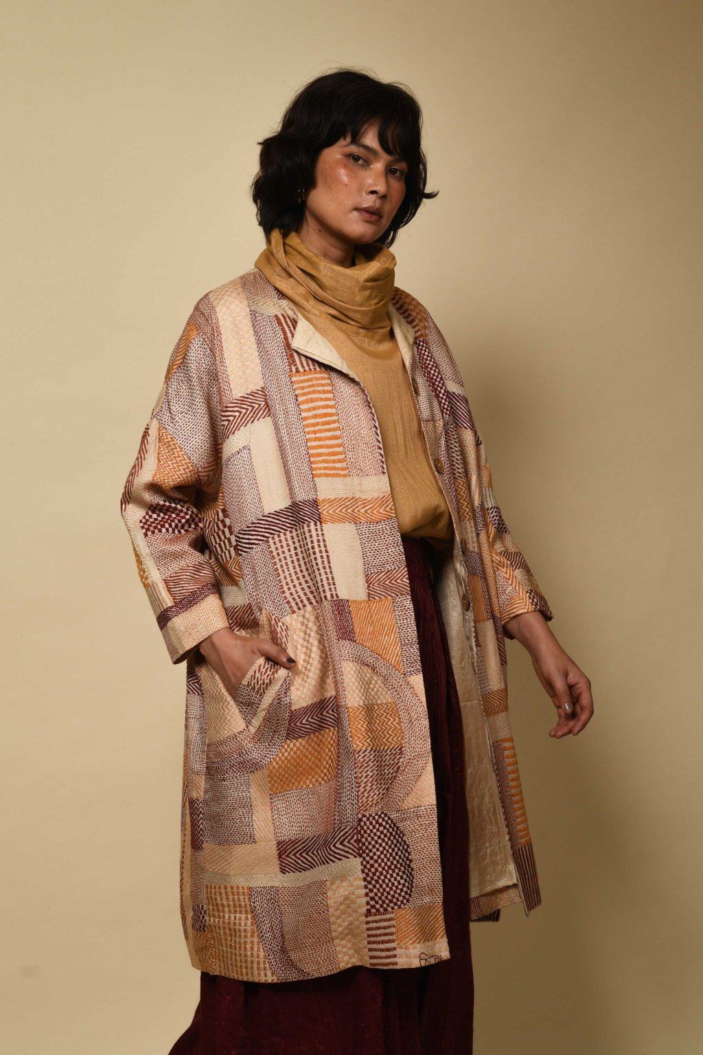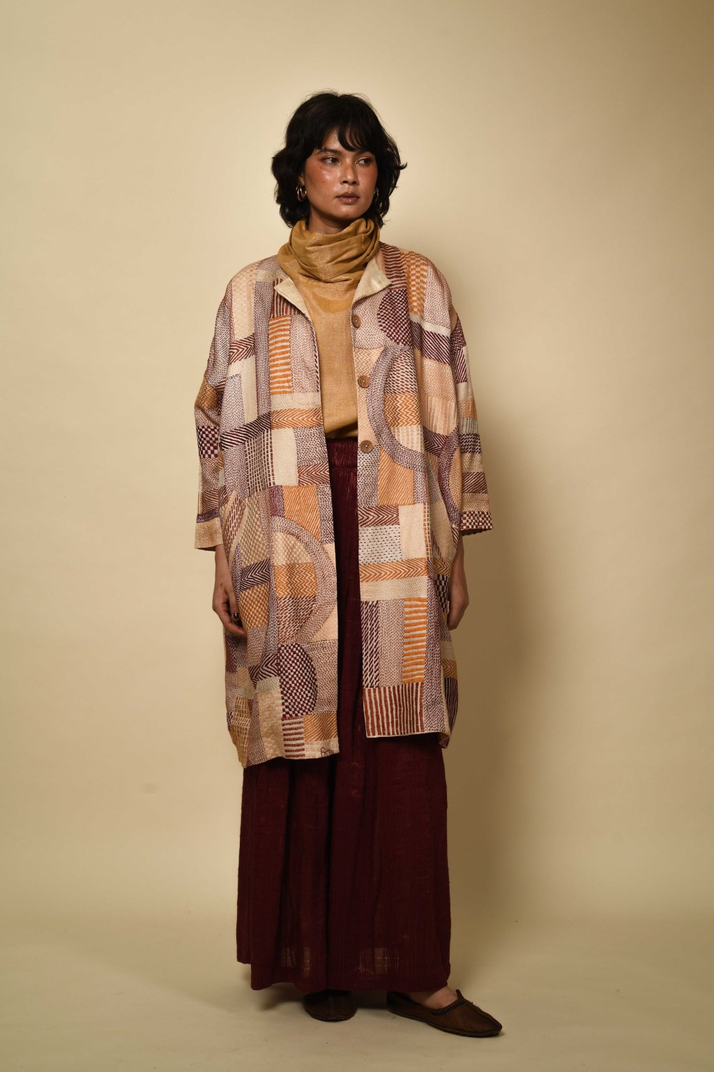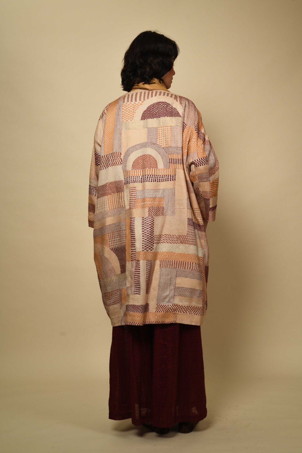 V naší kapsulové kolekci Jyaamiti Kantha dosahuje umění kantha svého absolutního vrcholu – je posunuto až na samé hranice toho, čeho dokáže lidská ruka dosáhnout. Každý kabát, ručně šitý našimi pozoruhodnými řemeslníky v Bengálsku z pravého hedvábí tussar, vzniká celých šest měsíců: je to rodinné dědictví v procesu vzniku, jehož kvalita a obětavost tvůrců jsou hodny vystavení v muzeu. Zde koexistuje přesnost s intuicí: každá linie je pečlivě odměřena, každý steh ožívá tichým rytmem lidských rukou. Napříč našimi kapsulovými kolekcemi Talisman se táhne jediná nitka: oděv jako umění, jako paměť. Každý kousek nese stopy svého tvůrce, váhu času a krásu zručnosti zdokonalované po generace.