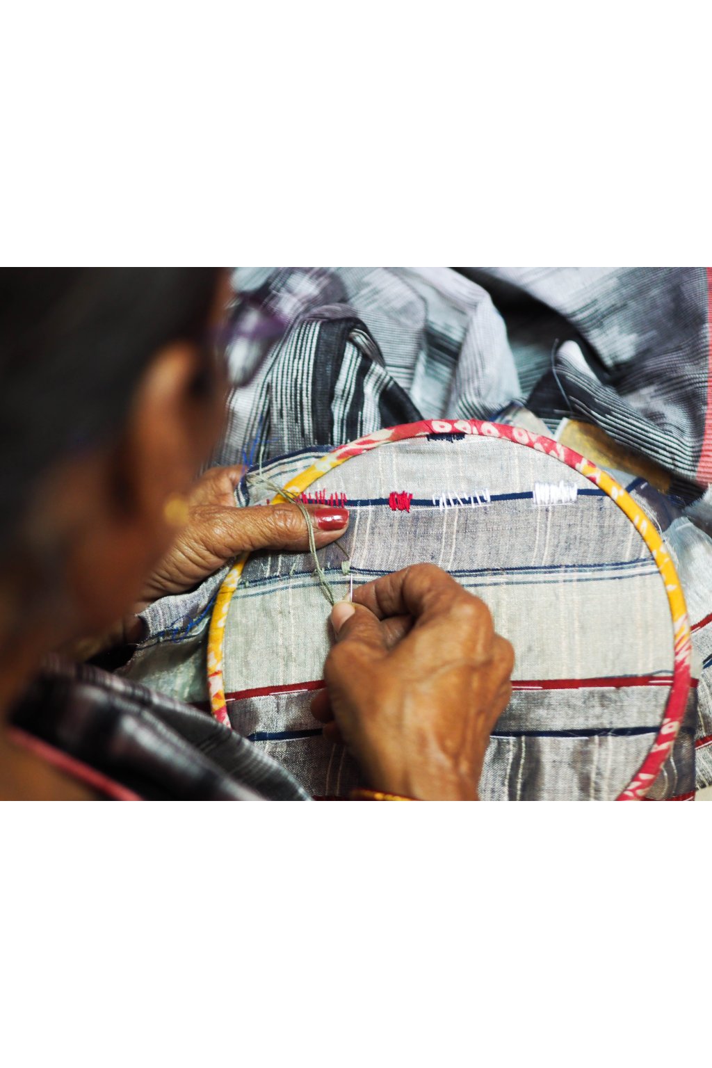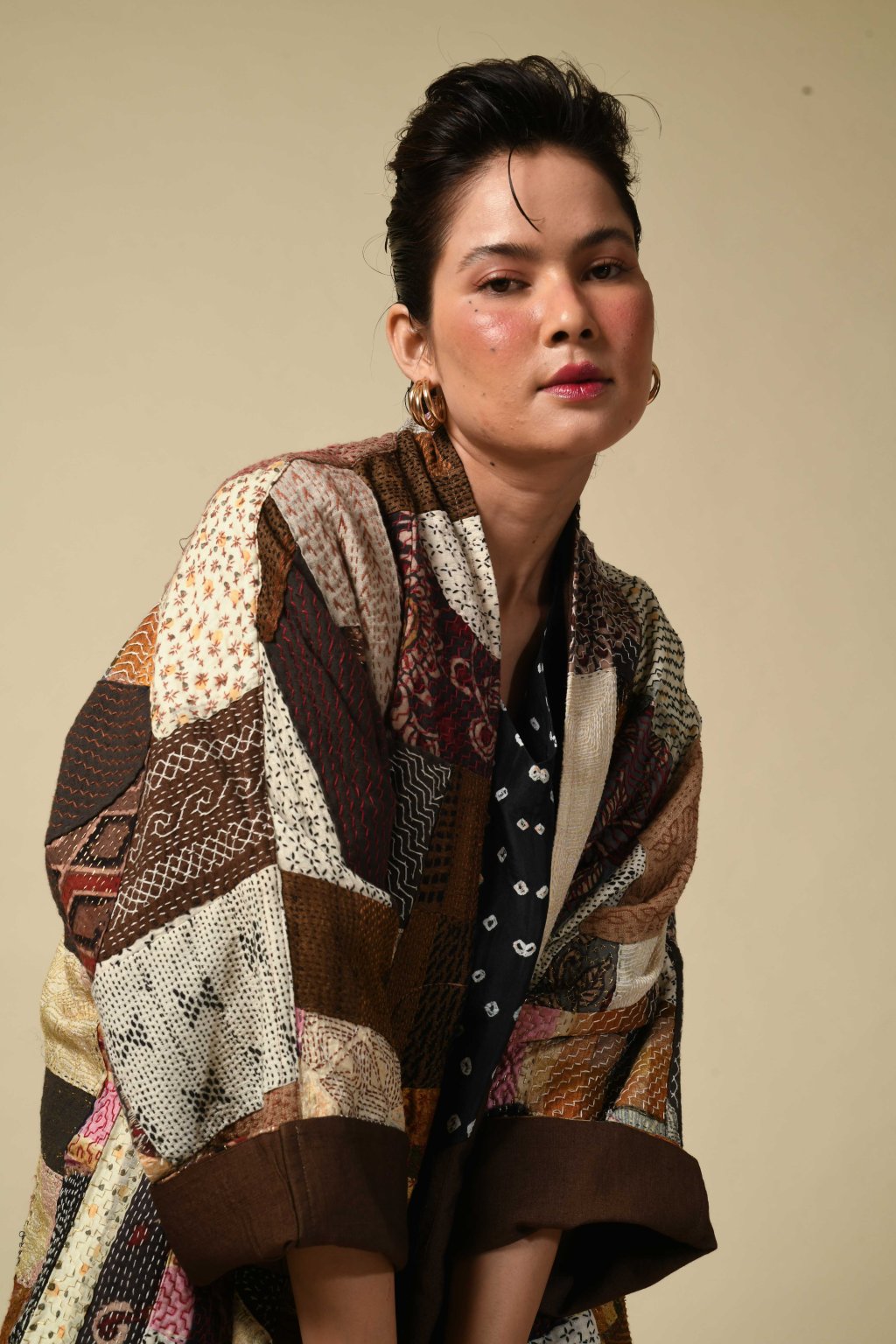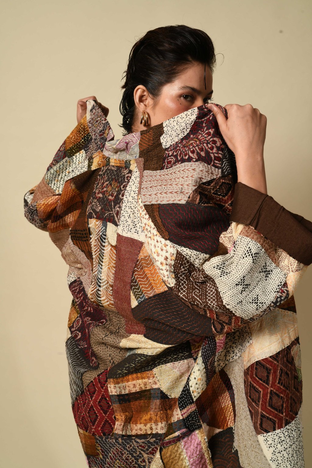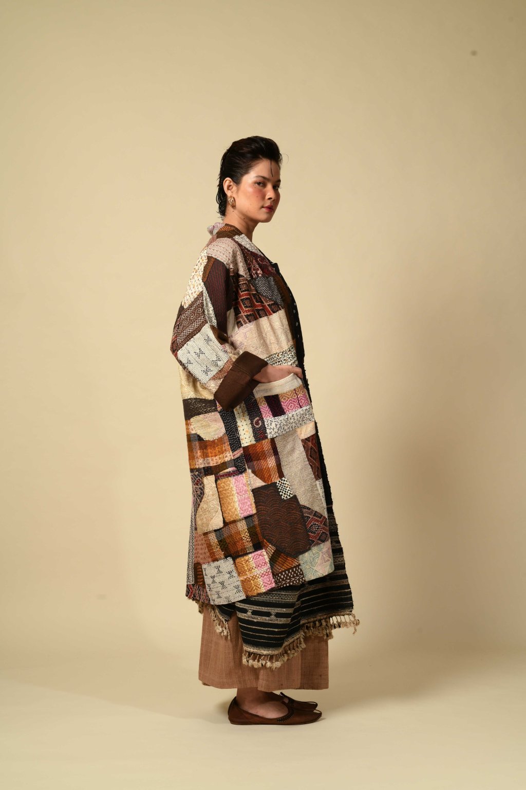 Tento pečlivý výběr zbytkových látek byl poté sešit do námi navrženého geometrického vzoru. Prošívání, které tyto díly pokrývá, prozkoumává rozsáhlý repertoár ruční výšivky kantha. Tento kabát je opravdovým vzorníkem kanthy, fascinující krajinou plnou výšivek. Je prostě úchvatný a můžeme vám zaručit, že nic podobného jste ještě neviděli!