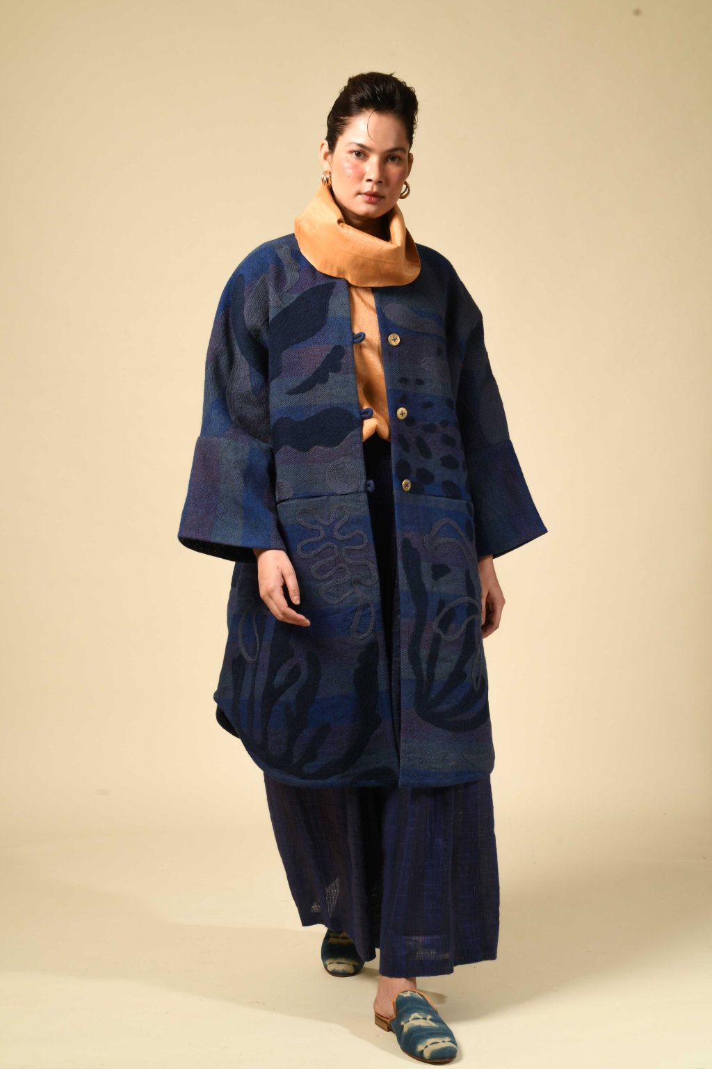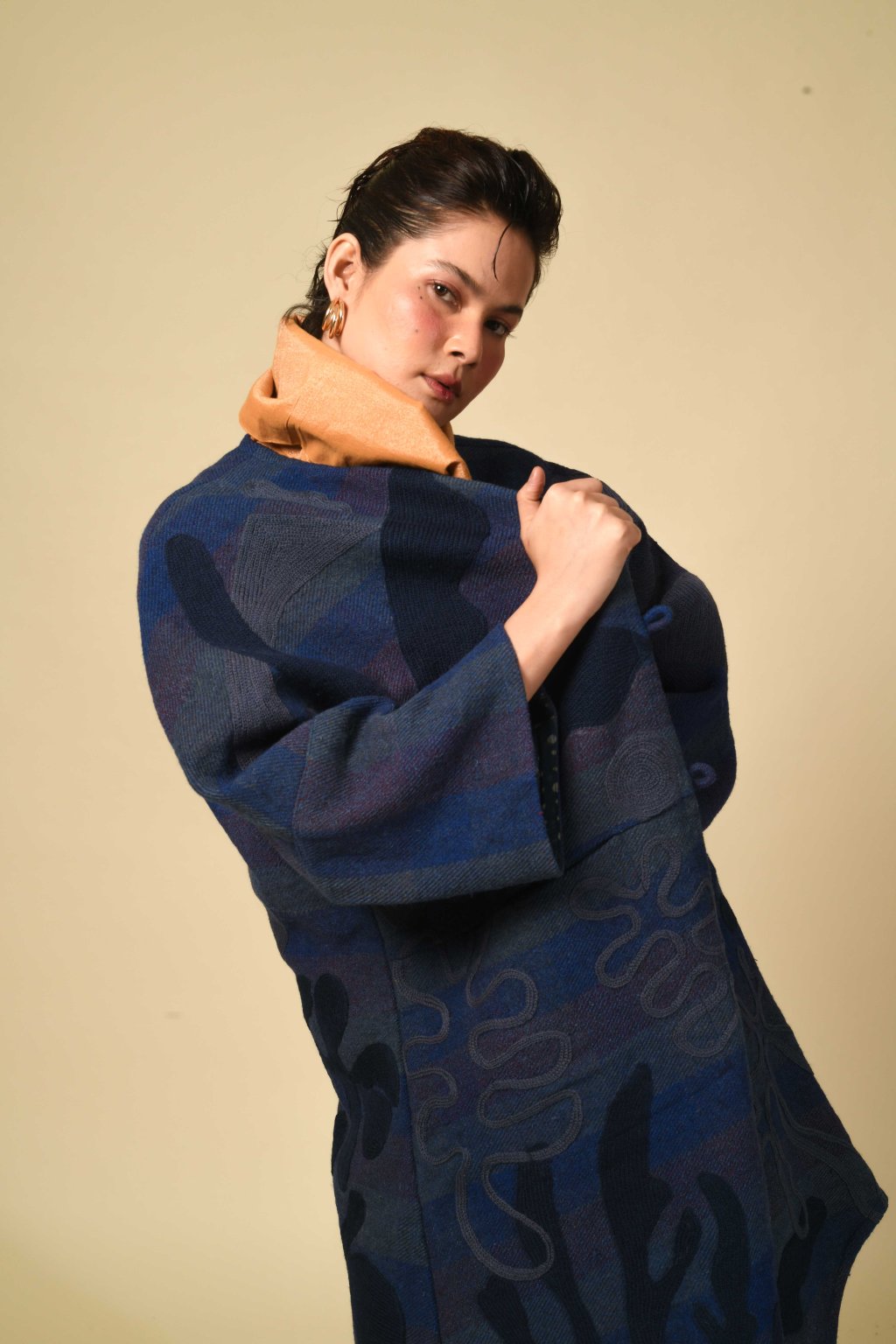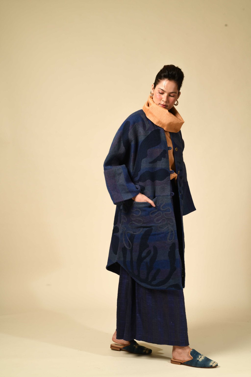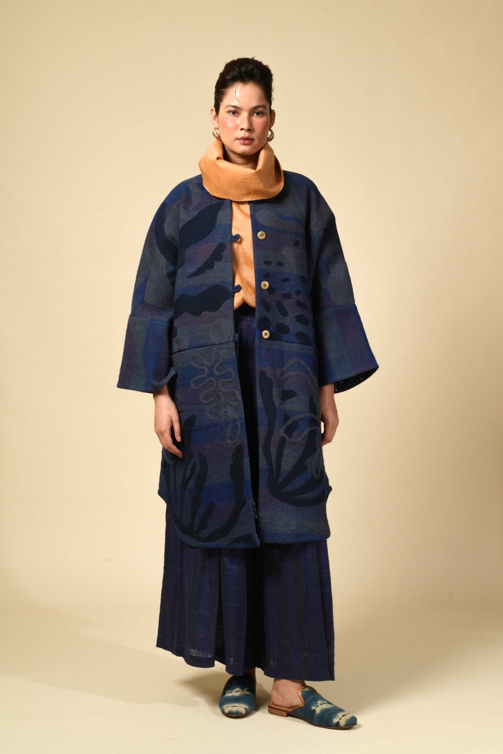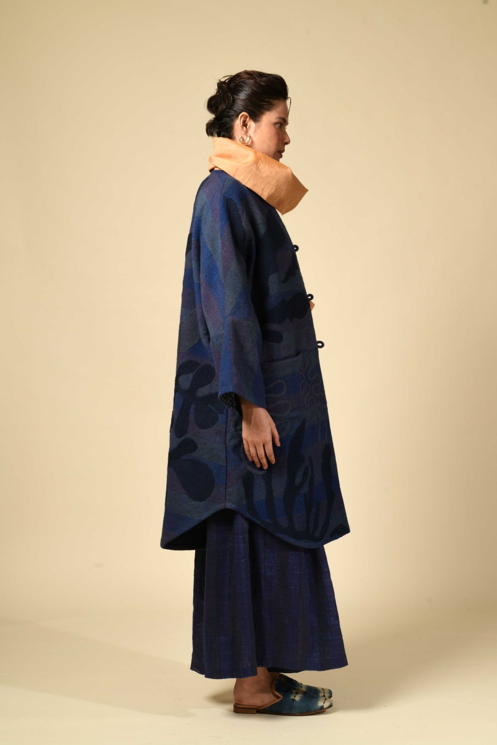 Tvorba tradičních textilií byla vždy aktem kontinuity – způsobem, jakým se minulost vplétá do současnosti. Ve 4. svazku naší kolekce Crewel dostává tato myšlenka podobu stehů, které v sobě nesou jak historii, tak nové pojetí. Naše charakteristická crewelová výšivka (výšivka vlněnou přízí) je nyní nově interpretována na podkladu z domácky spředené vlny, zpracované do ochranných, těžkých zimních kabátů; oděvů prostoupených příběhem a duší. Naše výšivka, mající kořeny v kašmírských údolích, čerpá ze staletí místního řemeslného umění, a přesto vzhlíží k modernistické odvaze Matissových vystřihovánek a malířských abstrakcí Sonii Delaunay, aby toto řemeslo přenesla do 21. století. Jako u všech přetrvávajících tradic spočívá její vitalita v jejím vývoji – v tom, že každé generaci umožňuje znovu interpretovat jazyk lidských rukou. Každý kousek v sobě skrývá napětí mezi dědictvím a transformací: starobylé dovednosti reinterpretované moderní optikou. To, co zůstává neměnné, je tichá síla rukou, rodová linie tvůrců a trvalé spojení mezi látkou, místem a vlastním já.