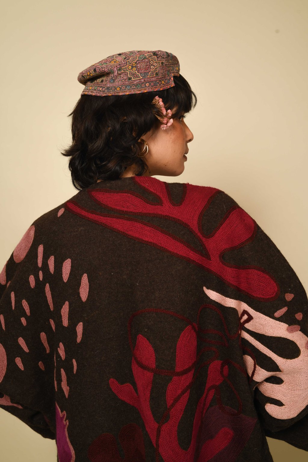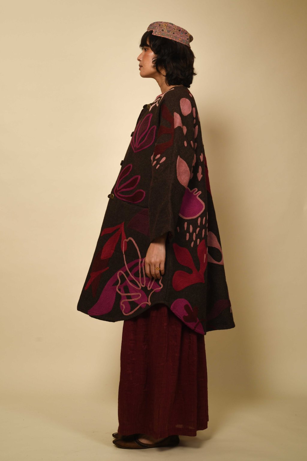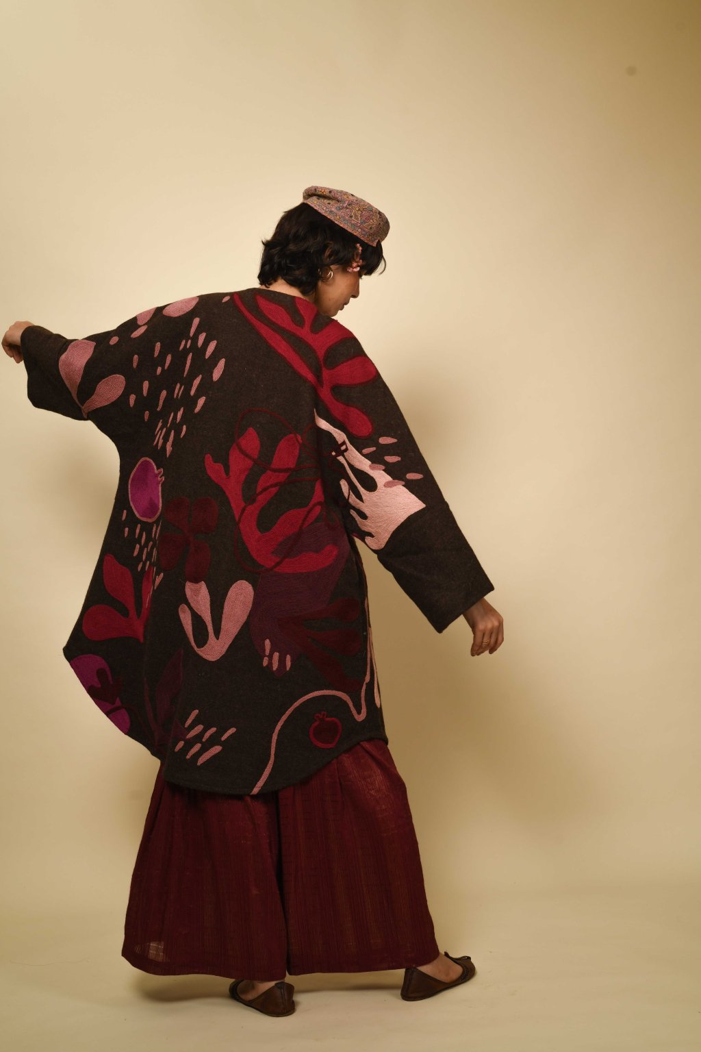 Tvorba tradičních textilií byla vždy aktem kontinuity – způsobem, jakým se minulost vplétá do současnosti. Ve 4. svazku naší kolekce Crewel dostává tato myšlenka podobu stehů, které v sobě nesou jak historii, tak nové pojetí. Naše charakteristická crewelová výšivka (výšivka vlněnou přízí) je nyní nově interpretována na podkladu z domácky spředené vlny, zpracované do ochranných, těžkých zimních kabátů; oděvů prostoupených příběhem a duší. Naše výšivka, mající kořeny v kašmírských údolích, čerpá ze staletí místního řemeslného umění, a přesto vzhlíží k modernistické odvaze Matissových vystřihovánek a malířských abstrakcí Sonii Delaunay, aby toto řemeslo přenesla do 21. století. Jako u všech přetrvávajících tradic spočívá její vitalita v jejím vývoji – v tom, že každé generaci umožňuje znovu interpretovat jazyk lidských rukou. Každý kousek v sobě skrývá napětí mezi dědictvím a transformací: starobylé dovednosti reinterpretované moderní optikou. To, co zůstává neměnné, je tichá síla rukou, rodová linie tvůrců a trvalé spojení mezi látkou, místem a vlastním já.