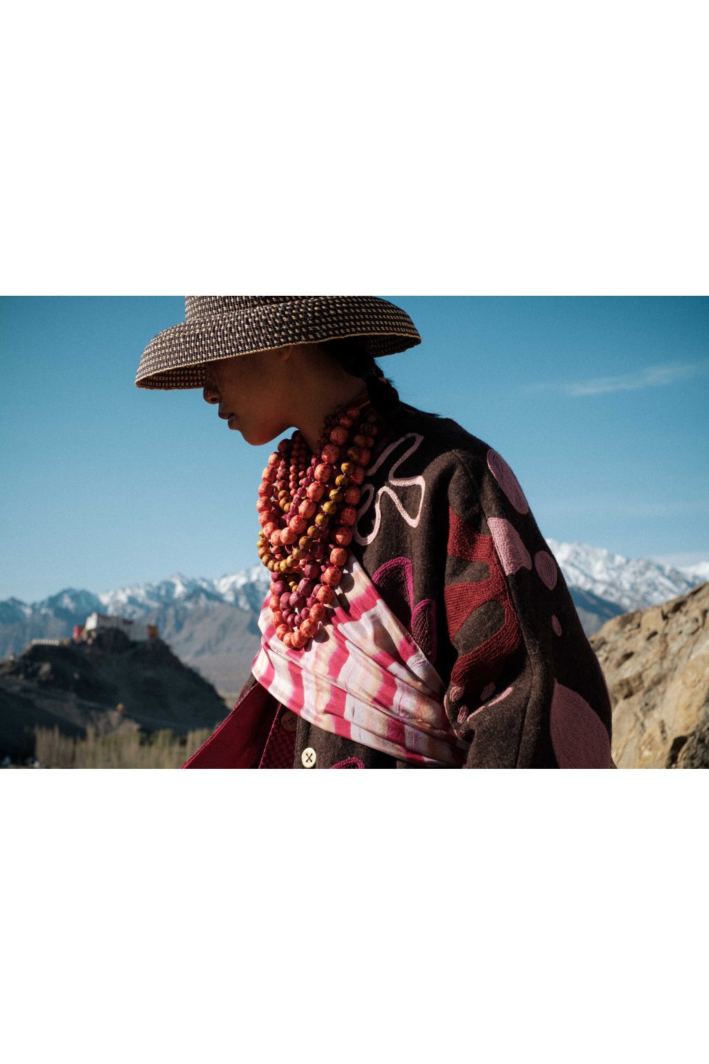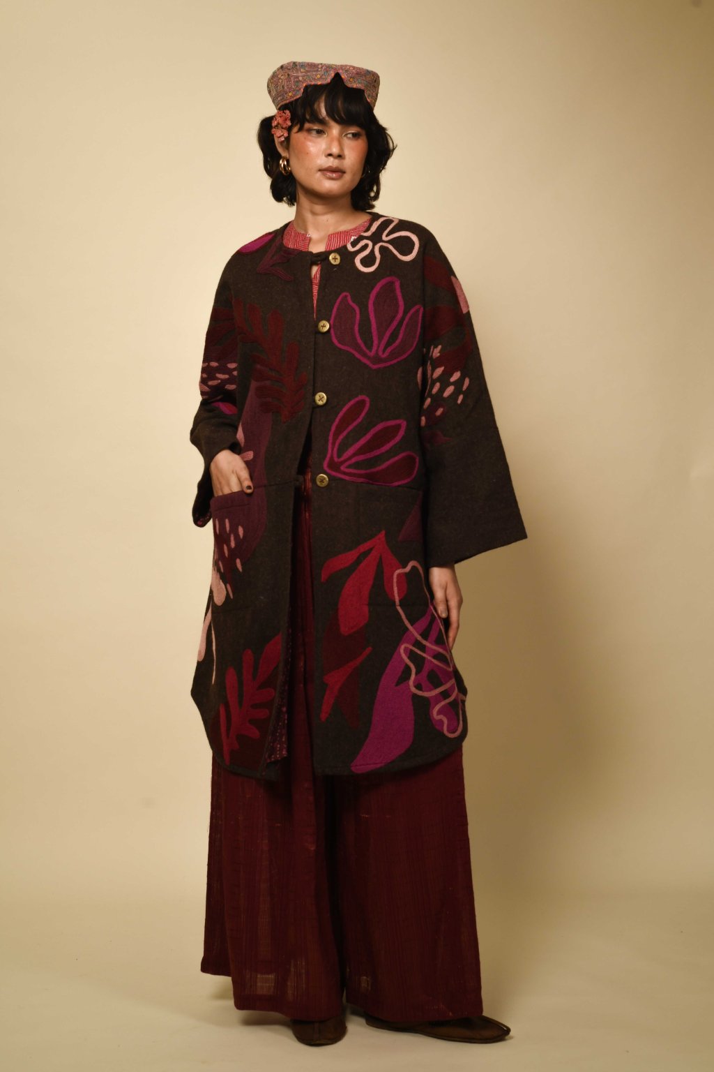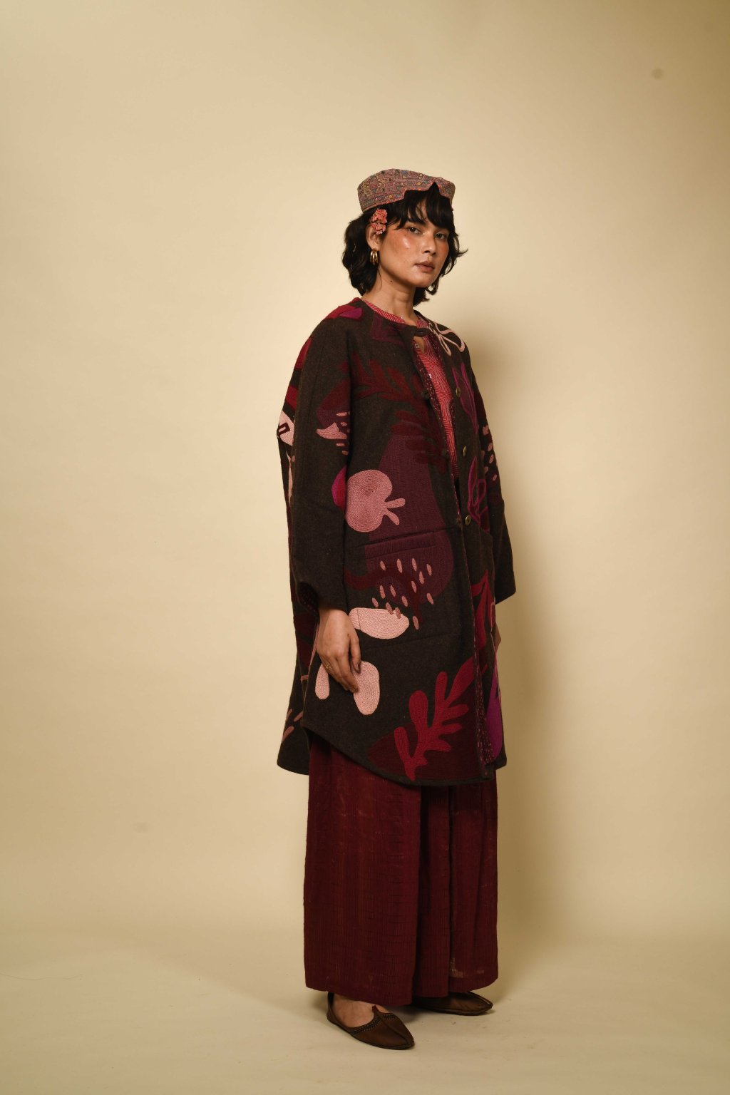 Tvorba tradičních textilií byla vždy aktem kontinuity – způsobem, jakým se minulost vplétá do současnosti. Ve 4. svazku naší kolekce Crewel dostává tato myšlenka podobu stehů, které v sobě nesou jak historii, tak nové pojetí. Naše charakteristická crewelová výšivka (výšivka vlněnou přízí) je nyní nově interpretována na podkladu z domácky spředené vlny, zpracované do ochranných, těžkých zimních kabátů; oděvů prostoupených příběhem a duší. Naše výšivka, mající kořeny v kašmírských údolích, čerpá ze staletí místního řemeslného umění, a přesto vzhlíží k modernistické odvaze Matissových vystřihovánek a malířských abstrakcí Sonii Delaunay, aby toto řemeslo přenesla do 21. století. Jako u všech přetrvávajících tradic spočívá její vitalita v jejím vývoji – v tom, že každé generaci umožňuje znovu interpretovat jazyk lidských rukou. Každý kousek v sobě skrývá napětí mezi dědictvím a transformací: starobylé dovednosti reinterpretované moderní optikou. To, co zůstává neměnné, je tichá síla rukou, rodová linie tvůrců a trvalé spojení mezi látkou, místem a vlastním já.