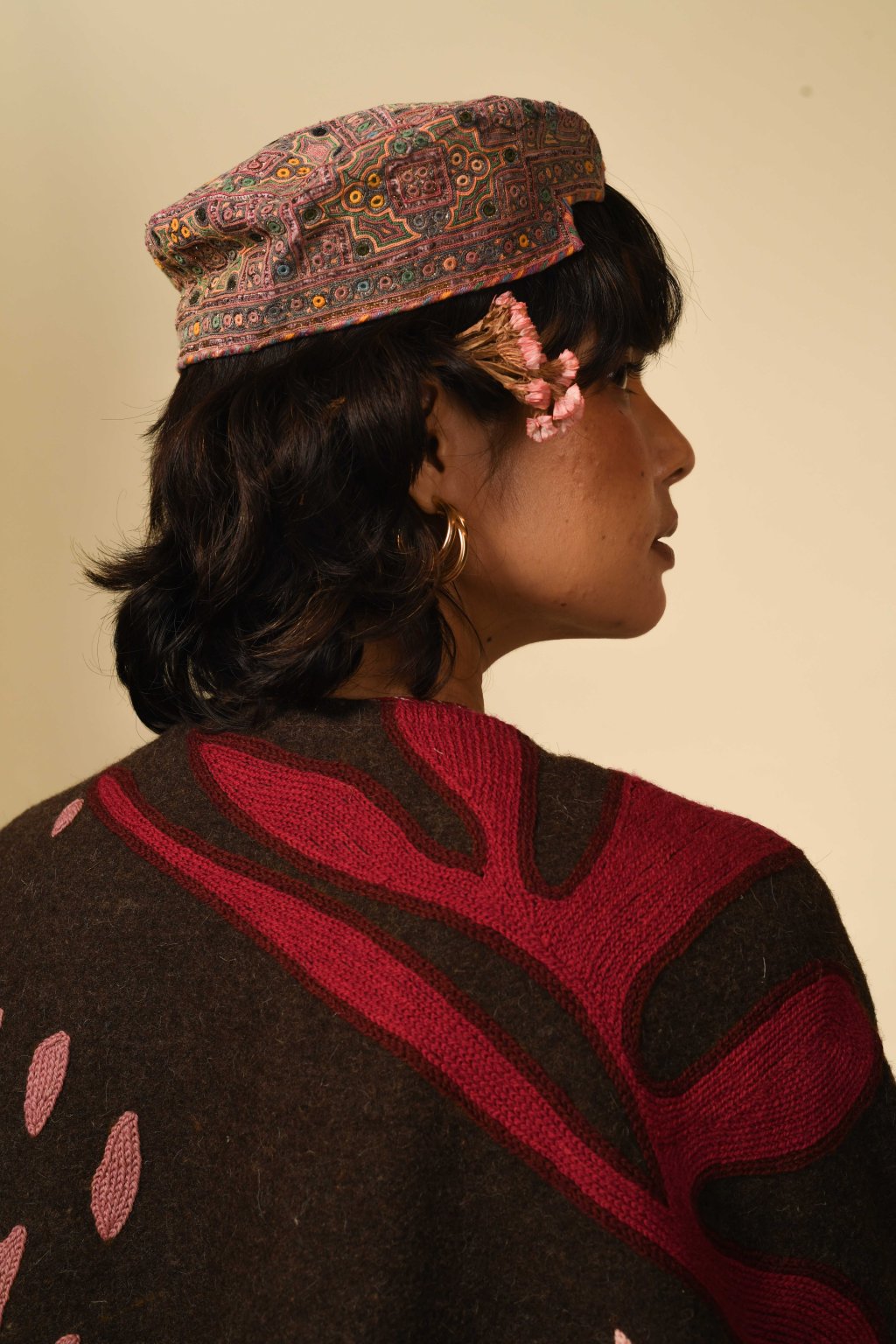 Tradičně kašmírská výšivka crewel obsahuje květinové motivy a vzory a používá se pro nábytek a interiéry. Naše charakteristická výšivka čerpá ze staleté místní řemeslné tradice, ale zároveň se inspiruje modernistickou odvahou Matissových výstřižků a malířskými abstrakcemi Sonii Delaunay, čímž toto řemeslo přenáší do 21. století. Stejně jako u všech živých tradic, i zde spočívá vitalita ve vývoji – v tom, že každá generace může nově interpretovat jazyk ruční práce. Každý kousek v sobě nese ono napětí mezi dědictvím a transformací: starodávná dovednost reinterpretovaná současnou optikou.