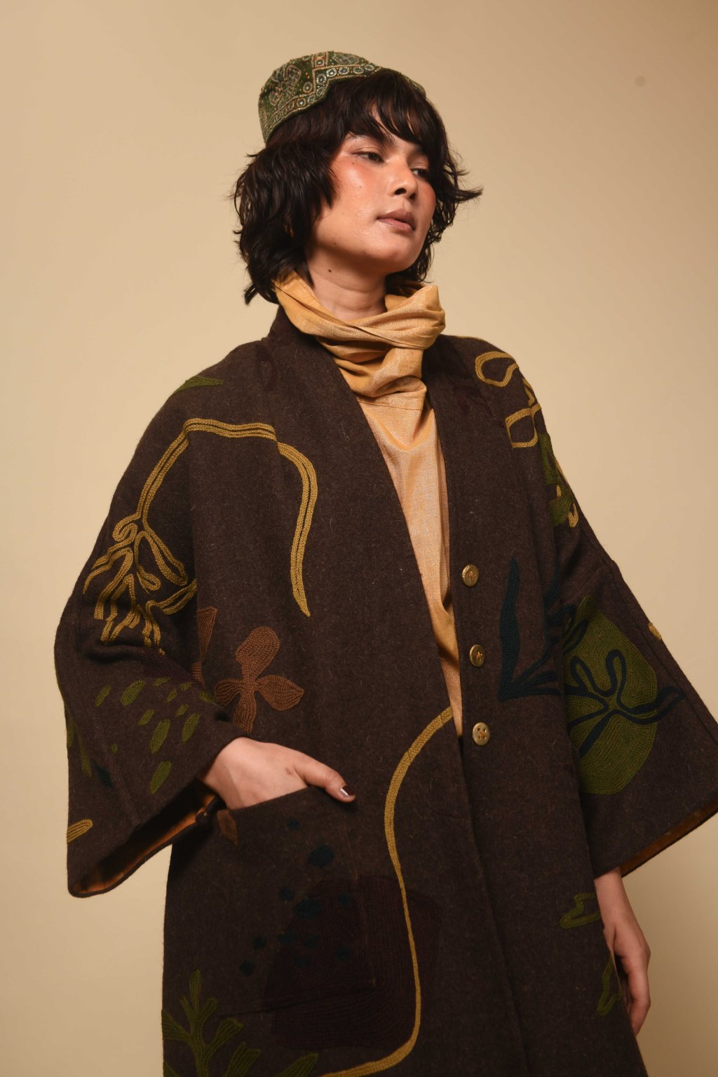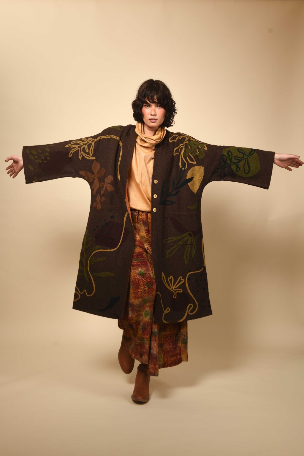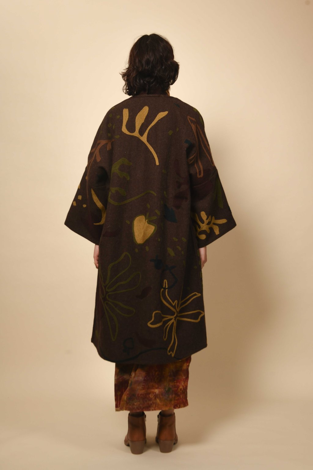 Tvorba tradičních textilií byla vždy aktem kontinuity – způsobem, jakým se minulost vplétá do současnosti. Ve 4. svazku naší kolekce Crewel dostává tato myšlenka podobu stehů, které v sobě nesou jak historii, tak nové pojetí. Naše charakteristická crewelová výšivka (výšivka vlněnou přízí) je nyní nově interpretována na podkladu z domácky spředené vlny, zpracované do ochranných, těžkých zimních kabátů; oděvů prostoupených příběhem a duší. Naše výšivka, mající kořeny v kašmírských údolích, čerpá ze staletí místního řemeslného umění, a přesto vzhlíží k modernistické odvaze Matissových vystřihovánek a malířských abstrakcí Sonii Delaunay, aby toto řemeslo přenesla do 21. století. Jako u všech přetrvávajících tradic spočívá její vitalita v jejím vývoji – v tom, že každé generaci umožňuje znovu interpretovat jazyk lidských rukou. Každý kousek v sobě skrývá napětí mezi dědictvím a transformací: starobylé dovednosti reinterpretované moderní optikou. To, co zůstává neměnné, je tichá síla rukou, rodová linie tvůrců a trvalé spojení mezi látkou, místem a vlastním já.