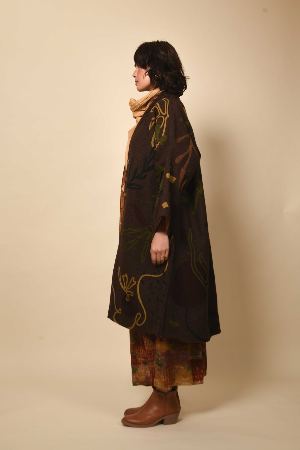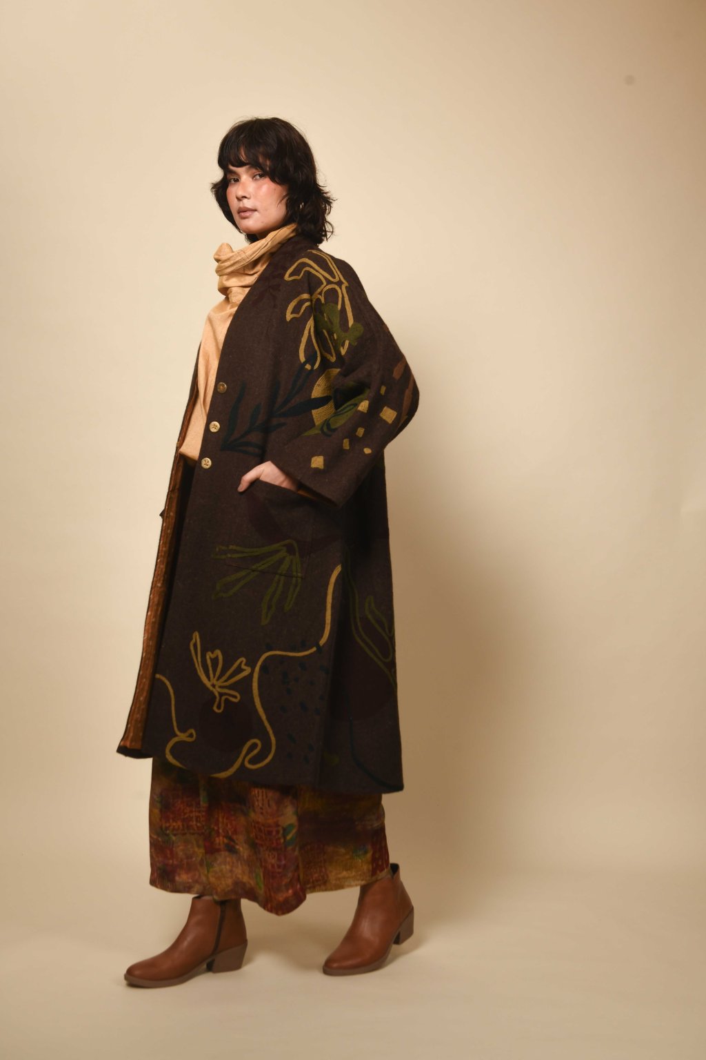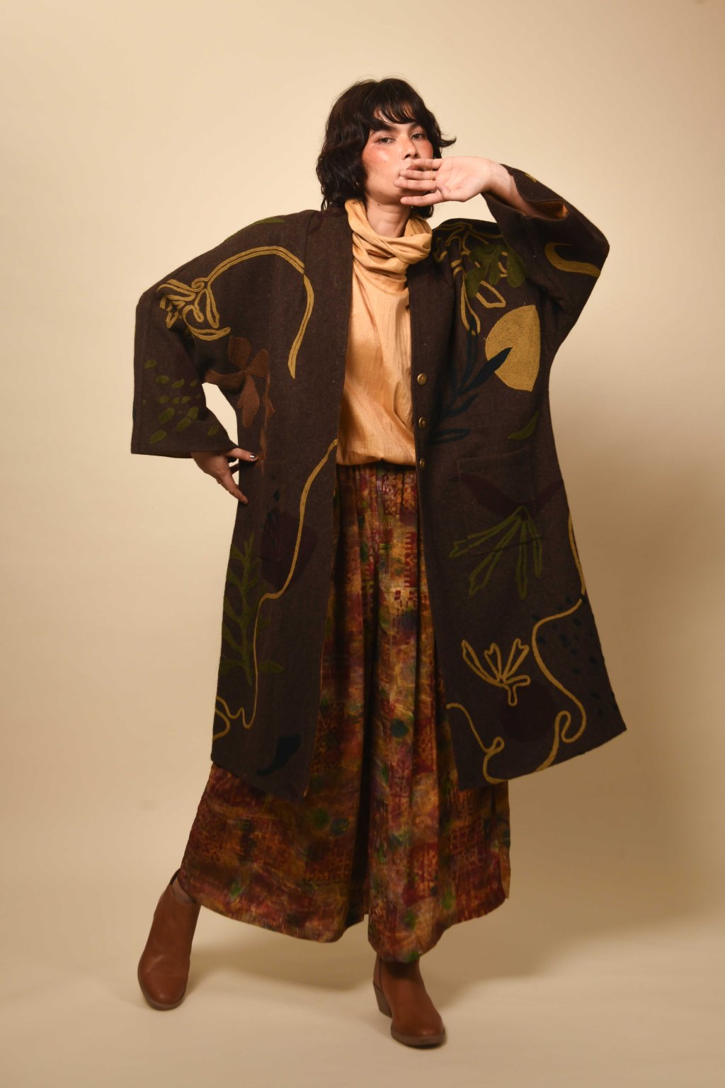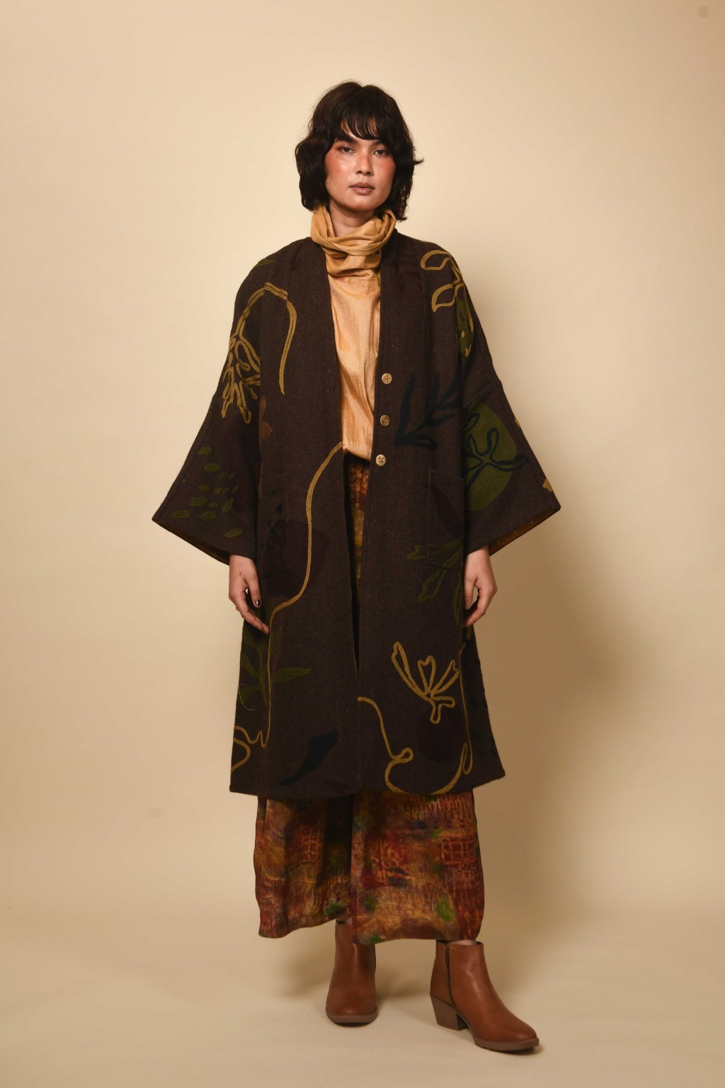 Tvorba tradičních textilií byla vždy aktem kontinuity – způsobem, jakým se minulost vplétá do současnosti. Ve 4. svazku naší kolekce Crewel dostává tato myšlenka podobu stehů, které v sobě nesou jak historii, tak nové pojetí. Naše charakteristická crewelová výšivka (výšivka vlněnou přízí) je nyní nově interpretována na podkladu z domácky spředené vlny, zpracované do ochranných, těžkých zimních kabátů; oděvů prostoupených příběhem a duší. Naše výšivka, mající kořeny v kašmírských údolích, čerpá ze staletí místního řemeslného umění, a přesto vzhlíží k modernistické odvaze Matissových vystřihovánek a malířských abstrakcí Sonii Delaunay, aby toto řemeslo přenesla do 21. století. Jako u všech přetrvávajících tradic spočívá její vitalita v jejím vývoji – v tom, že každé generaci umožňuje znovu interpretovat jazyk lidských rukou. Každý kousek v sobě skrývá napětí mezi dědictvím a transformací: starobylé dovednosti reinterpretované moderní optikou. To, co zůstává neměnné, je tichá síla rukou, rodová linie tvůrců a trvalé spojení mezi látkou, místem a vlastním já.