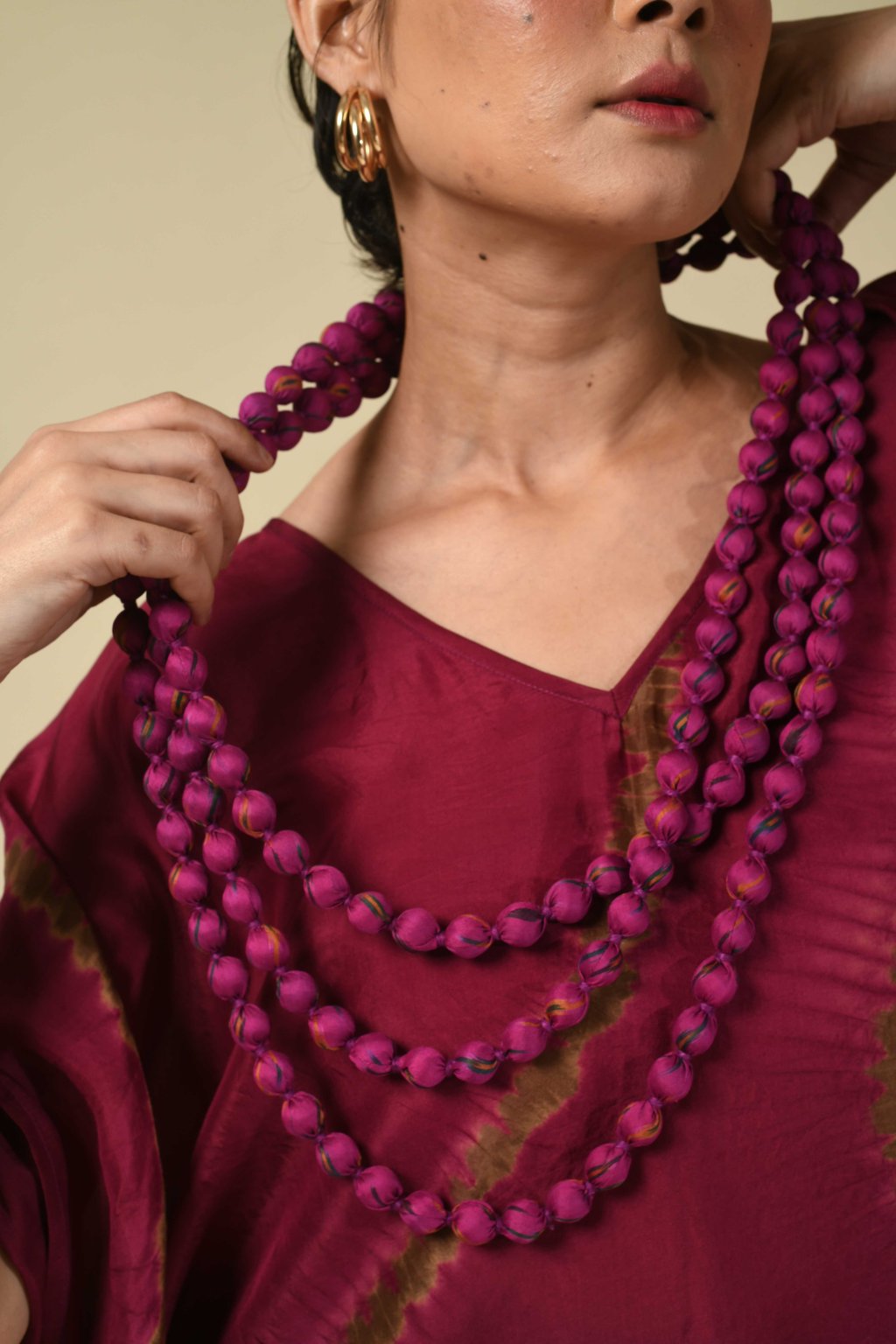 Korálkový náhrdelník ze sárí - 3řadý | magenta