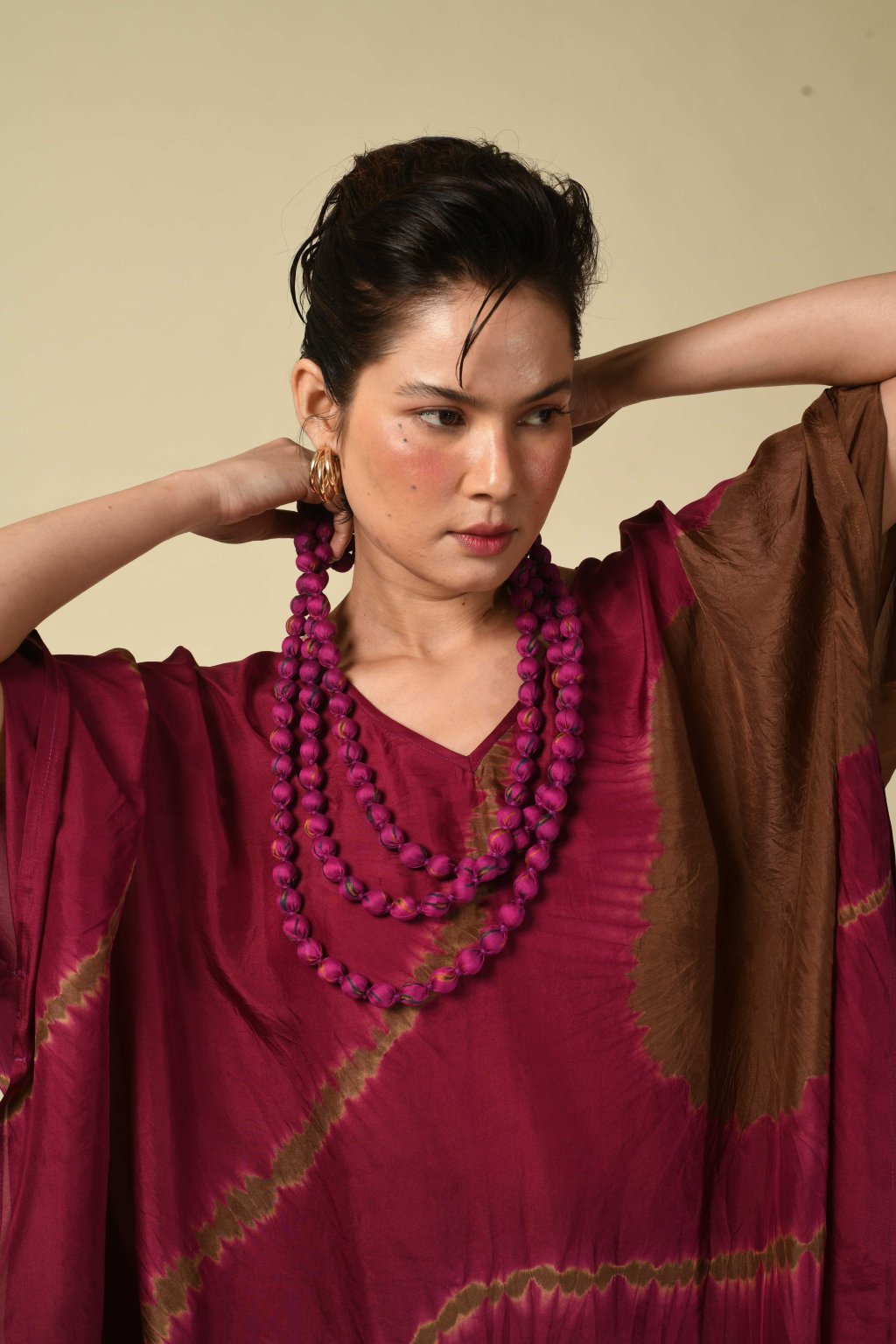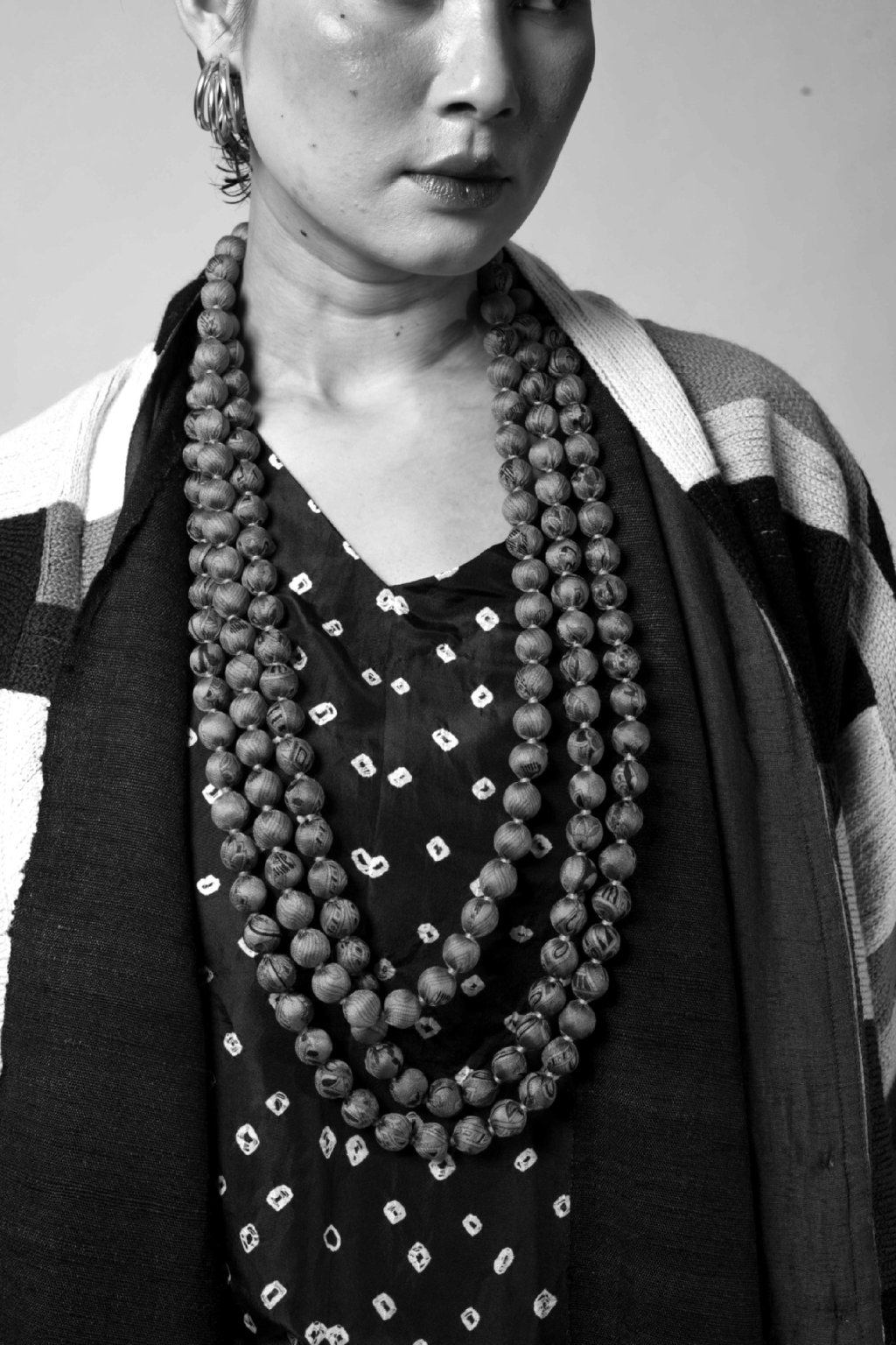 Každý krok v tomto procesu má svůj jasný záměr. Nejprve v naší dílně vybereme ty nejvýraznější barvy a potisky z hor zbytků recyklovaných sárí. Tyto ústřižky jsou následně sladěny s barevnými bavlněnými nitěmi, které vybíráme kus po kusu pro maximální vizuální přitažlivost, a sešity do úzkých trubiček. U našich korálkových modelů řemeslníci plní tyto trubičky dřevěnými modlitebními korálky a každý jednotlivý korálek ručně zajistí na svém místě pomocí prošívání.