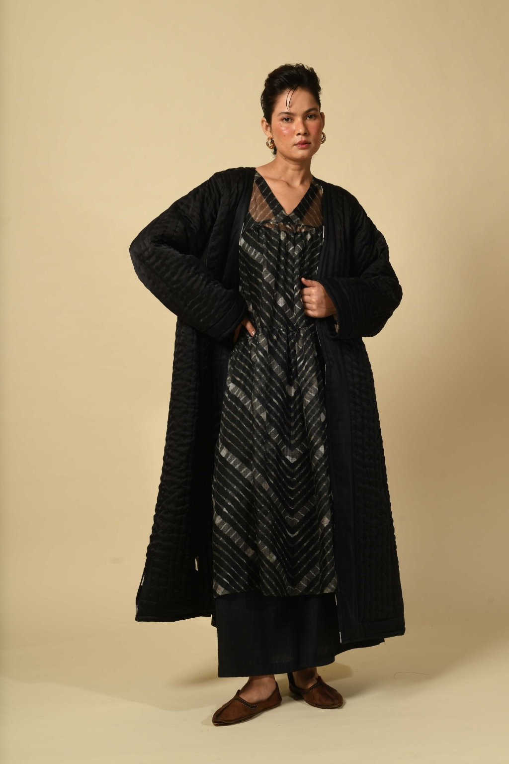 Uvnitř Talismanu má každý oděv svůj význam: jako rituál, jako vzpomínka, jako dědictví. Naše kapsulová kolekce Itajime hovoří o oděvu jako o umění a kultuře. Itajime je starověká japonská tradice rezervážního barvení textilu, při které se látka skládá, svírá mezi dřevěné bloky a ponořuje do barvy, čímž vznikají působivé geometrické vzory. Ve studiu House of Wandering Silk indičtí řemeslníci tuto techniku nově aplikovali na lesklé hedvábí – na textilie, které svou splývavostí a zářivým povrchem umocňují drama samotné geometrie. Každý kousek se tak stává dialogem napříč geografickými hranicemi: japonská preciznost a dědictví se setkávají s indickým uměním, struktura se rozplývá v pohybu, když látka plyne společně s tělem. Výsledkem je abstrakce ožívající barvou a světlem. V kolekci Itajime se hedvábí stává plátnem a oděv se stává uměním.