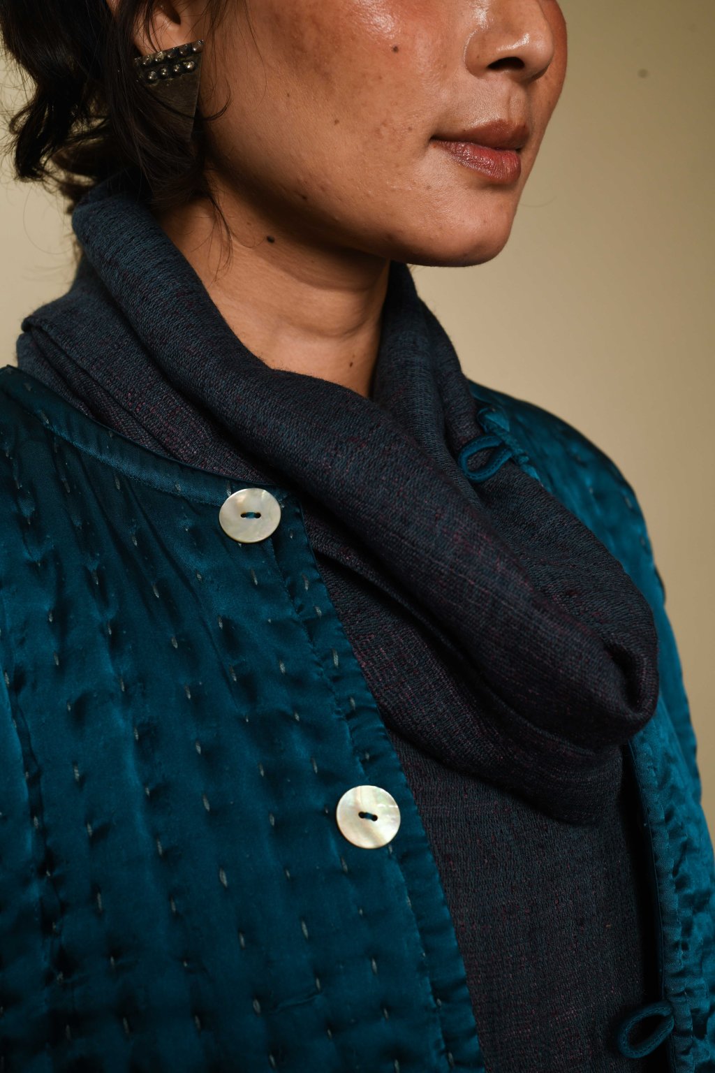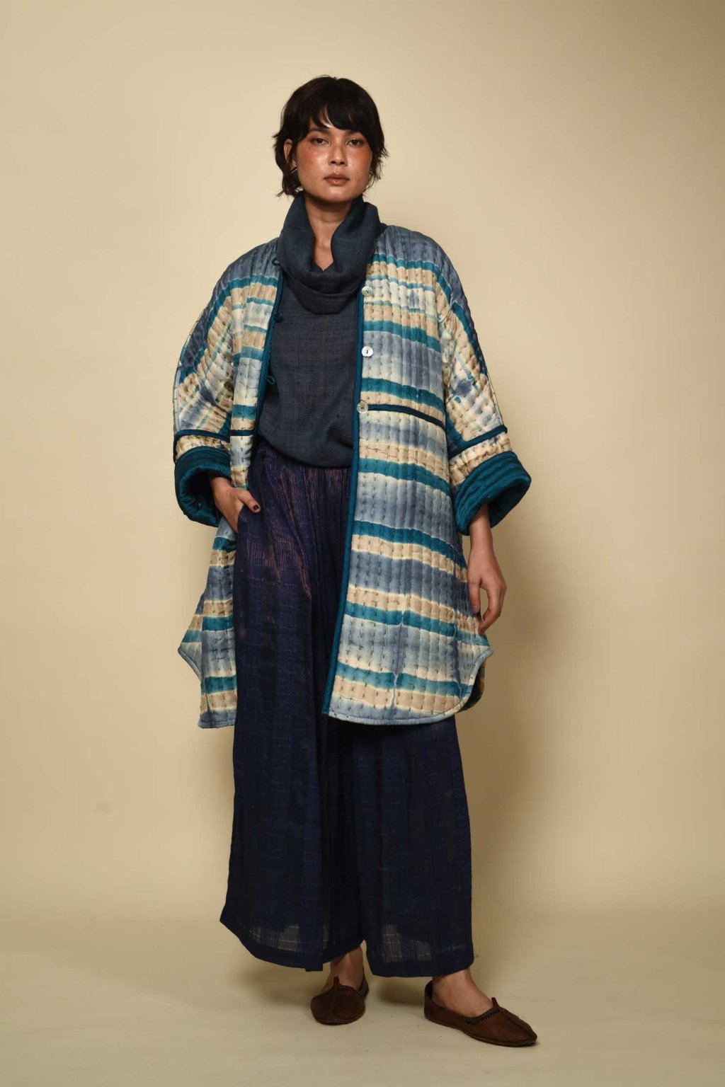 Uvnitř Talismanu má každý oděv svůj význam: jako rituál, jako vzpomínka, jako dědictví. Naše kapsulová kolekce Itajime hovoří o oděvu jako o umění a kultuře. Itajime je starověká japonská tradice rezervážního barvení textilu, při které se látka skládá, svírá mezi dřevěné bloky a ponořuje do barvy, čímž vznikají působivé geometrické vzory. Ve studiu House of Wandering Silk indičtí řemeslníci tuto techniku nově aplikovali na lesklé hedvábí – na textilie, které svou splývavostí a zářivým povrchem umocňují drama samotné geometrie. Každý kousek se tak stává dialogem napříč geografickými hranicemi: japonská preciznost a dědictví se setkávají s indickým uměním, struktura se rozplývá v pohybu, když látka plyne společně s tělem. Výsledkem je abstrakce ožívající barvou a světlem. V kolekci Itajime se hedvábí stává plátnem a oděv se stává uměním.