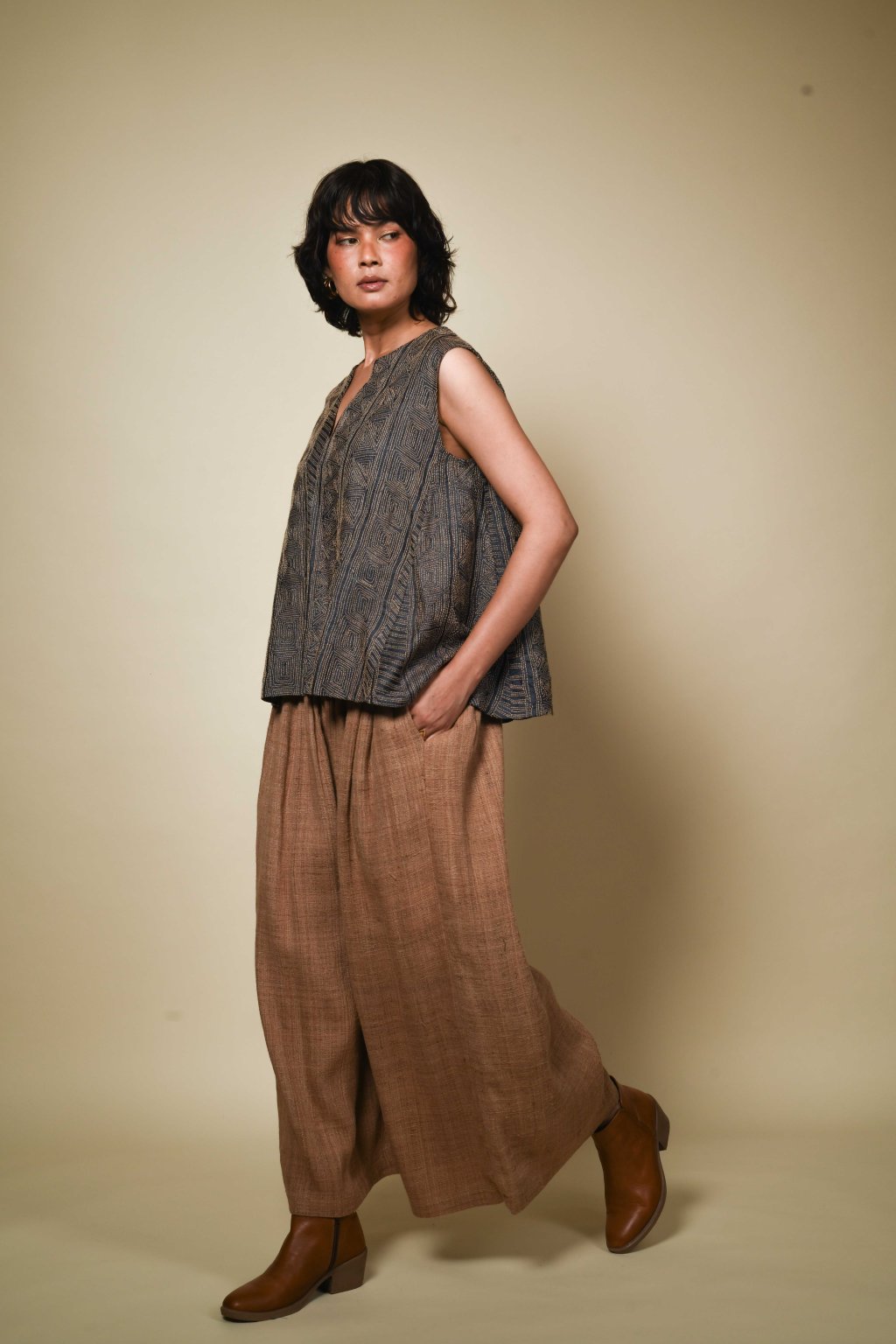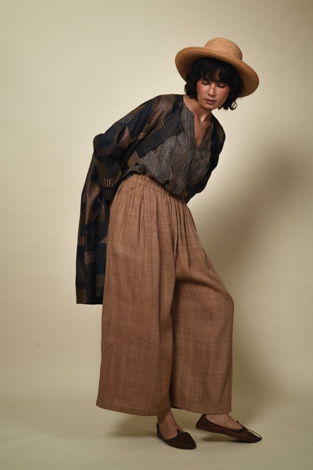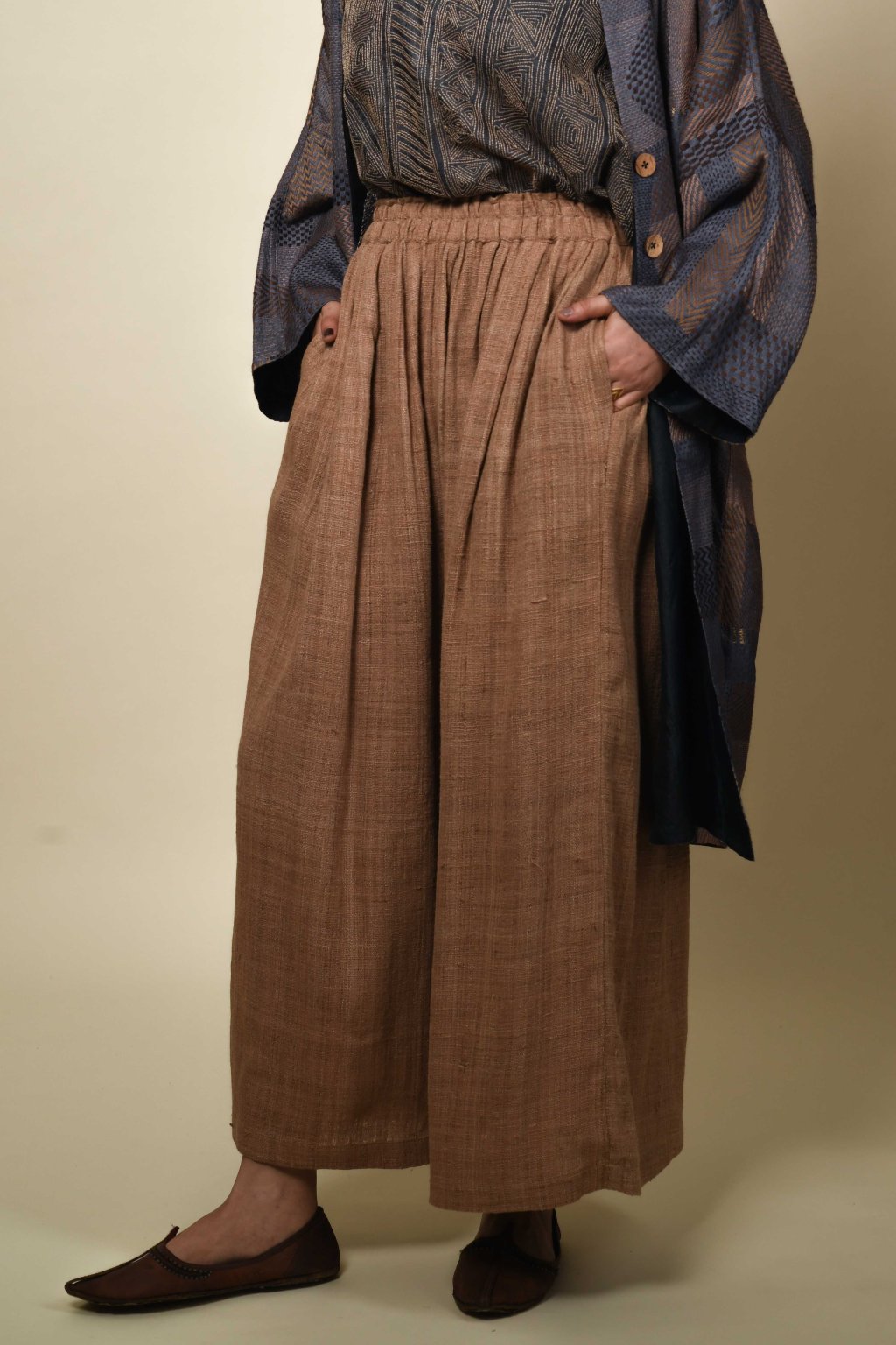 Palazzo kalhoty z mírumilovného hedvábí Eri | přírodně barvená teaková béžová