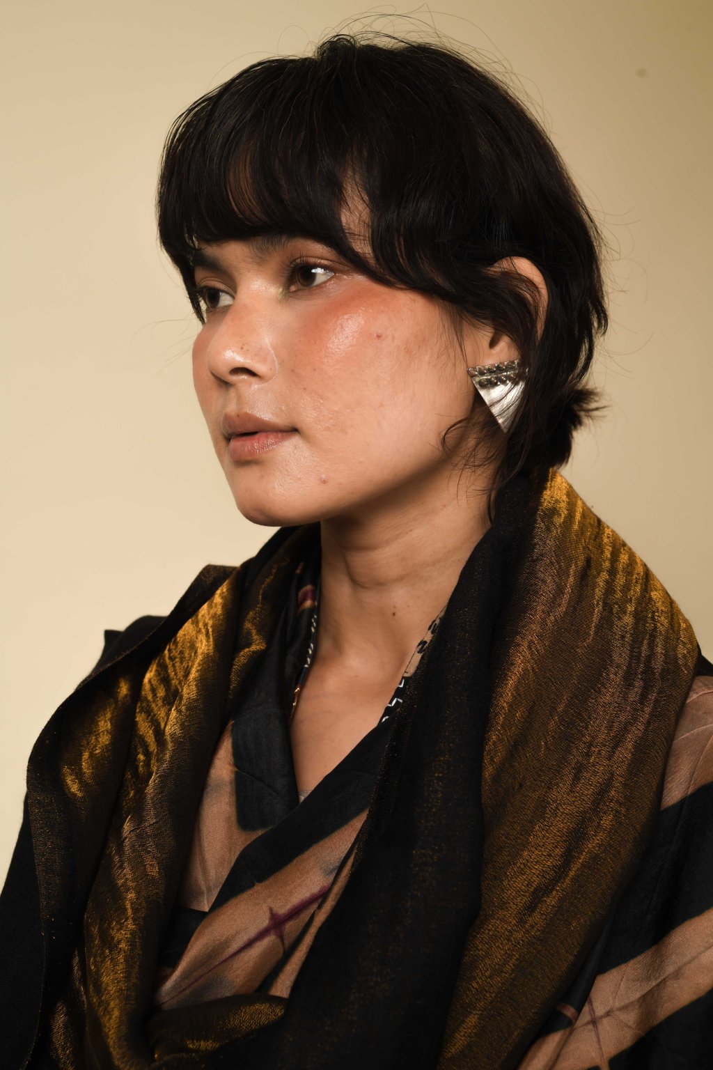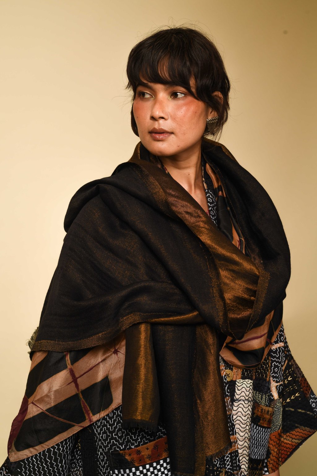 Mimořádně lehká a hebká oboustranná šála z merino vlny: z jedné strany čistá merino vlna, z druhé strany jemně lesklé zlaté vlákno zari.