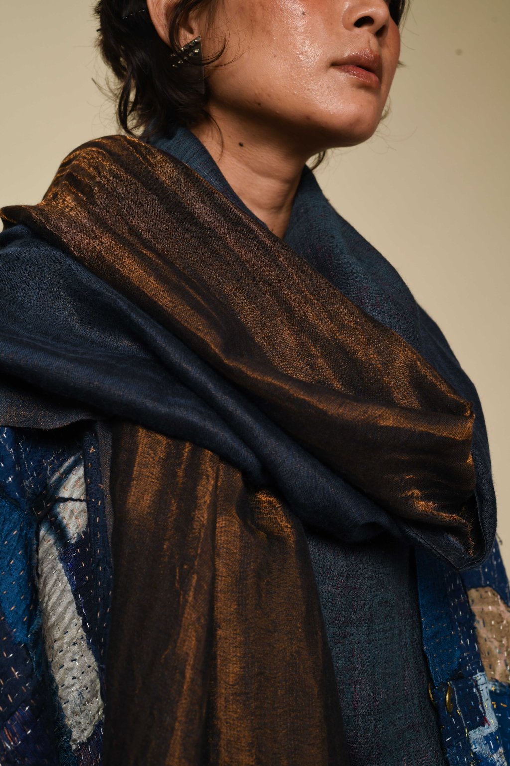 Mimořádně lehká a hebká oboustranná šála z merino vlny: jedna strana je z čisté merino vlny, druhá z jemně lesklého zlatého vlákna zari.