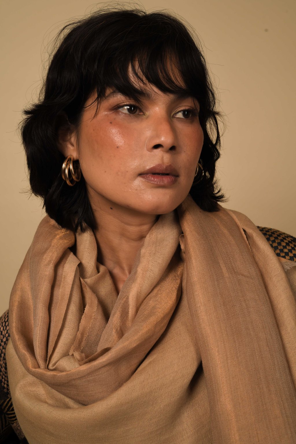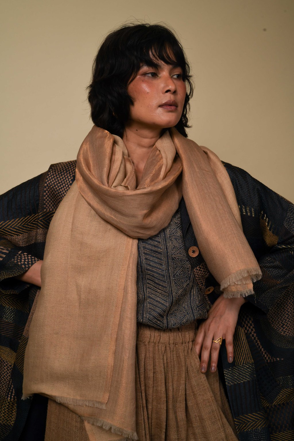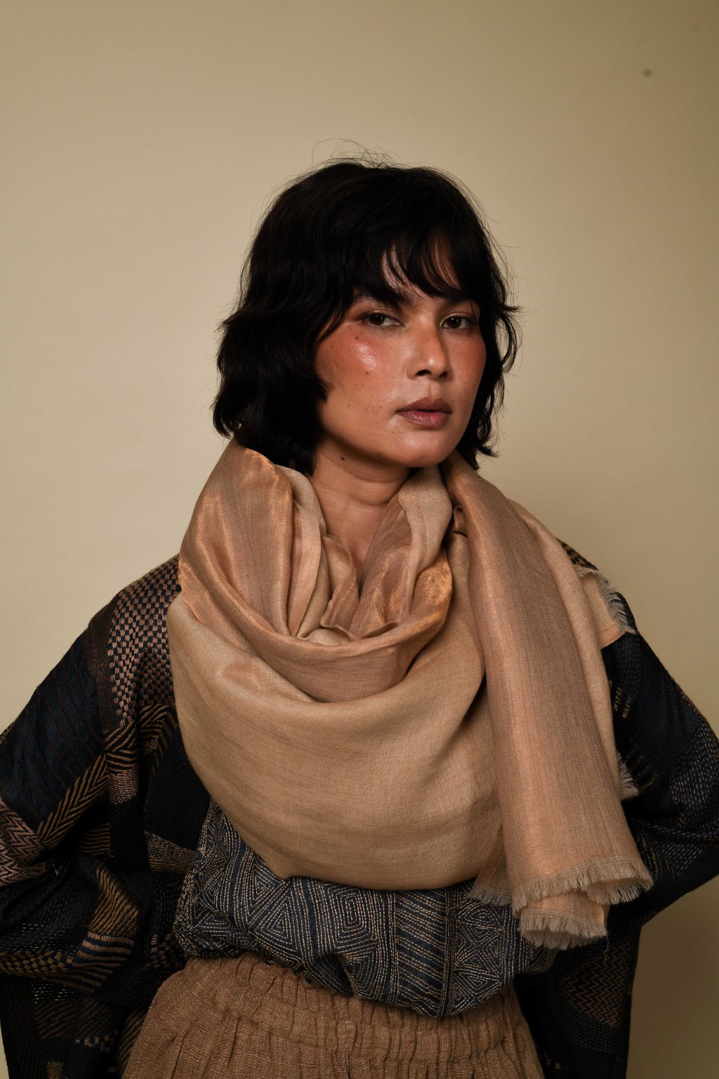 Mimořádně lehká a hebká oboustranná šála z merino vlny: jedna strana je z merino vlny, druhá z jemně lesklého zlatého zari. Strojově tkaná v Kašmíru, domově těch nejkvalitnějších vlněných tkanin.