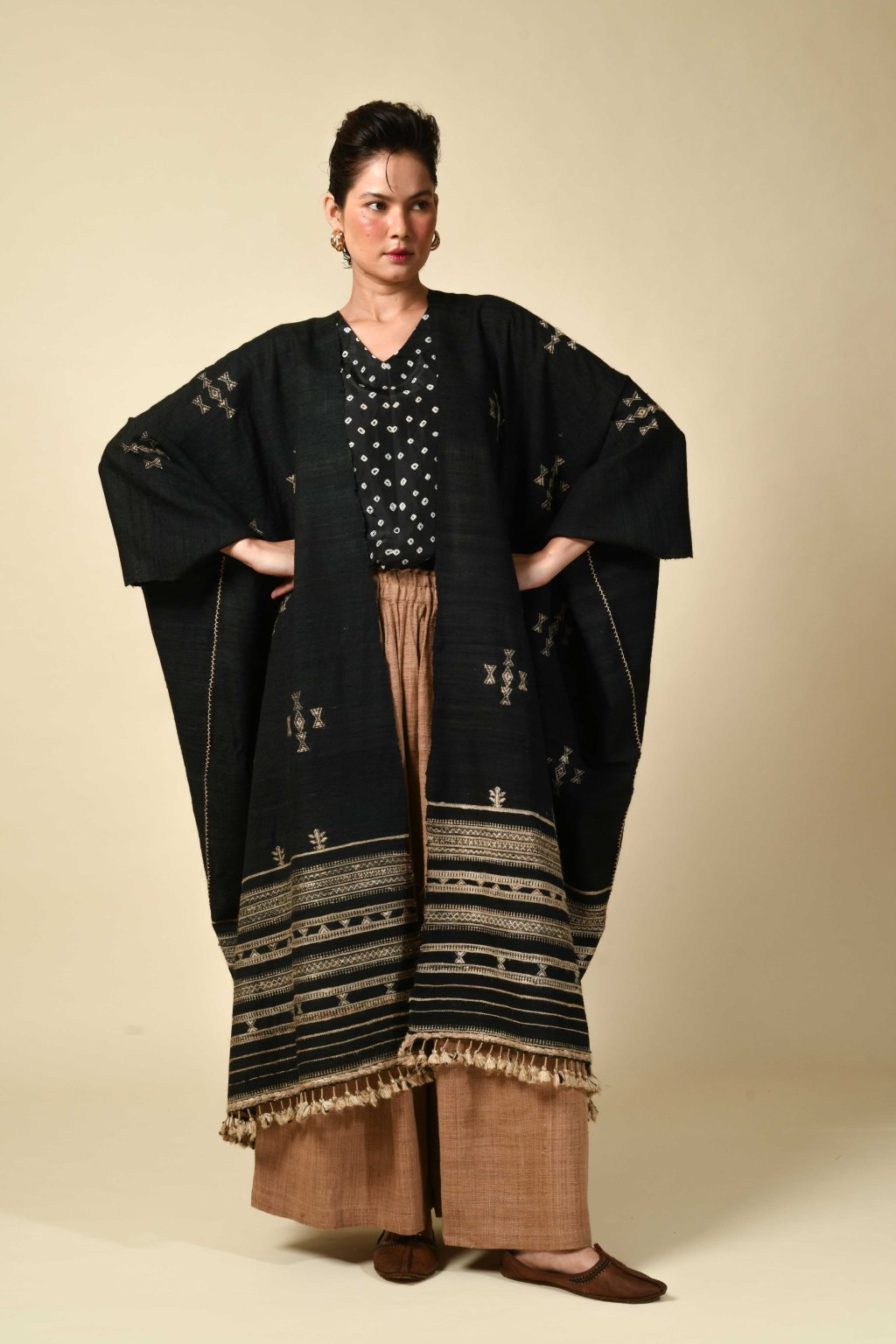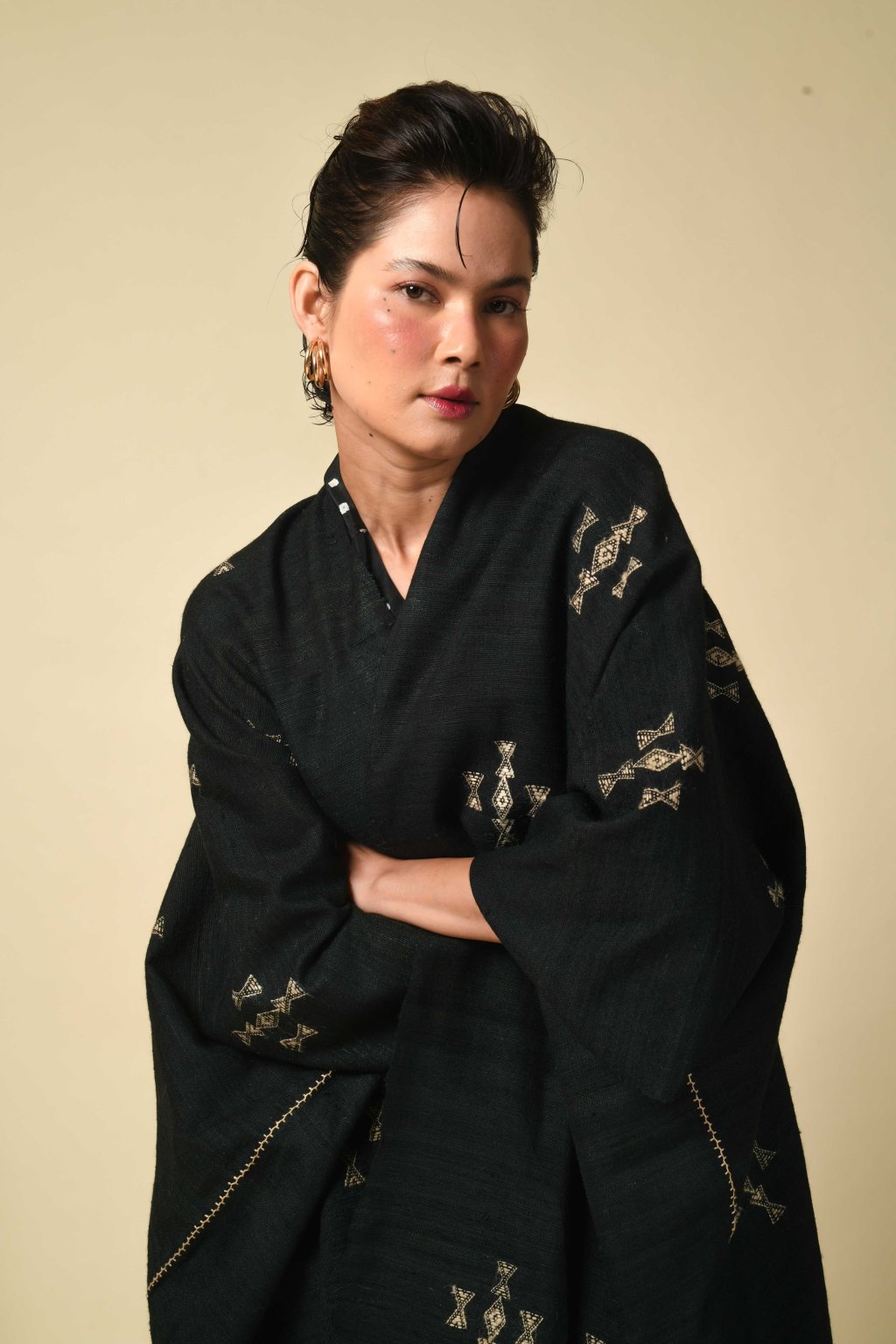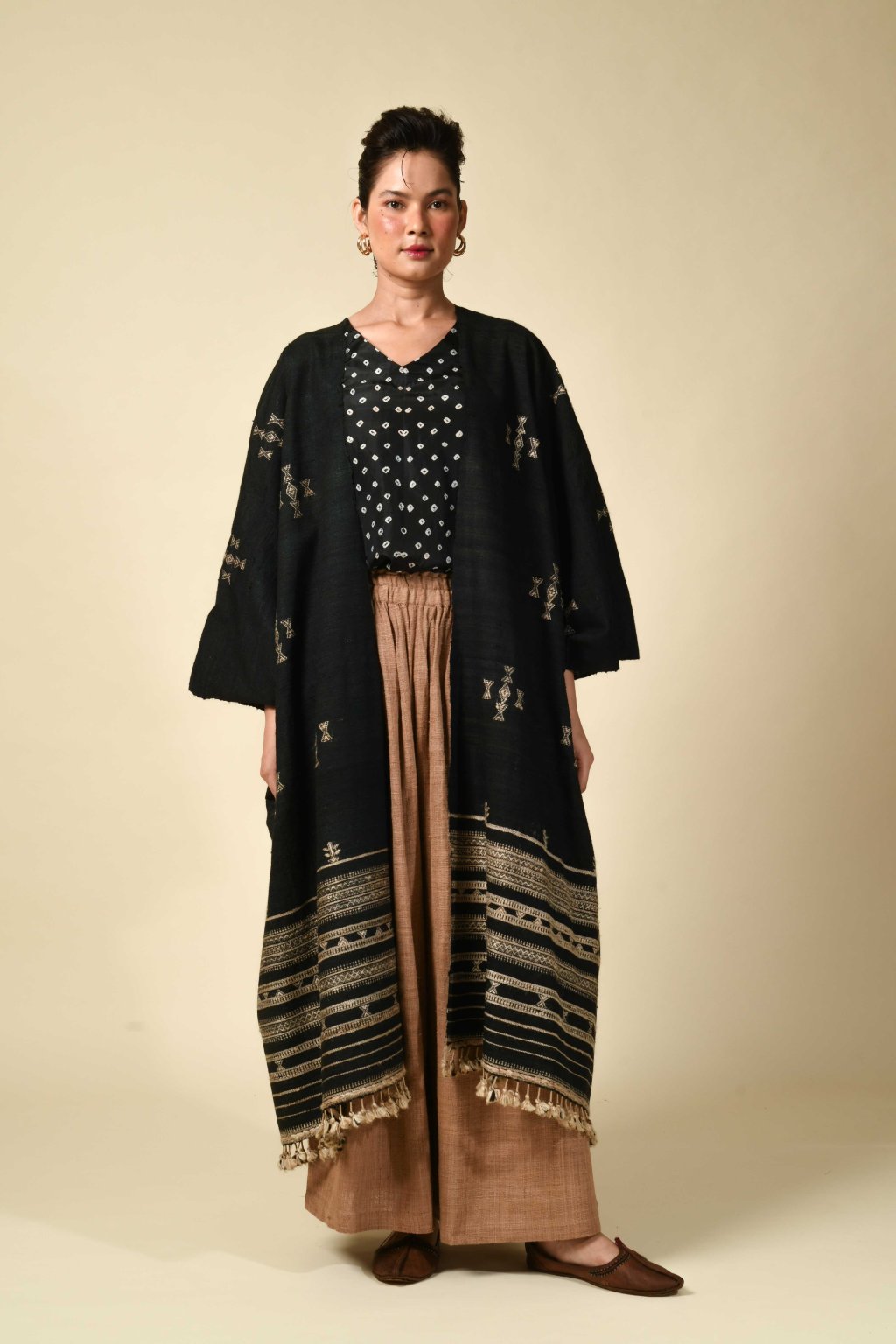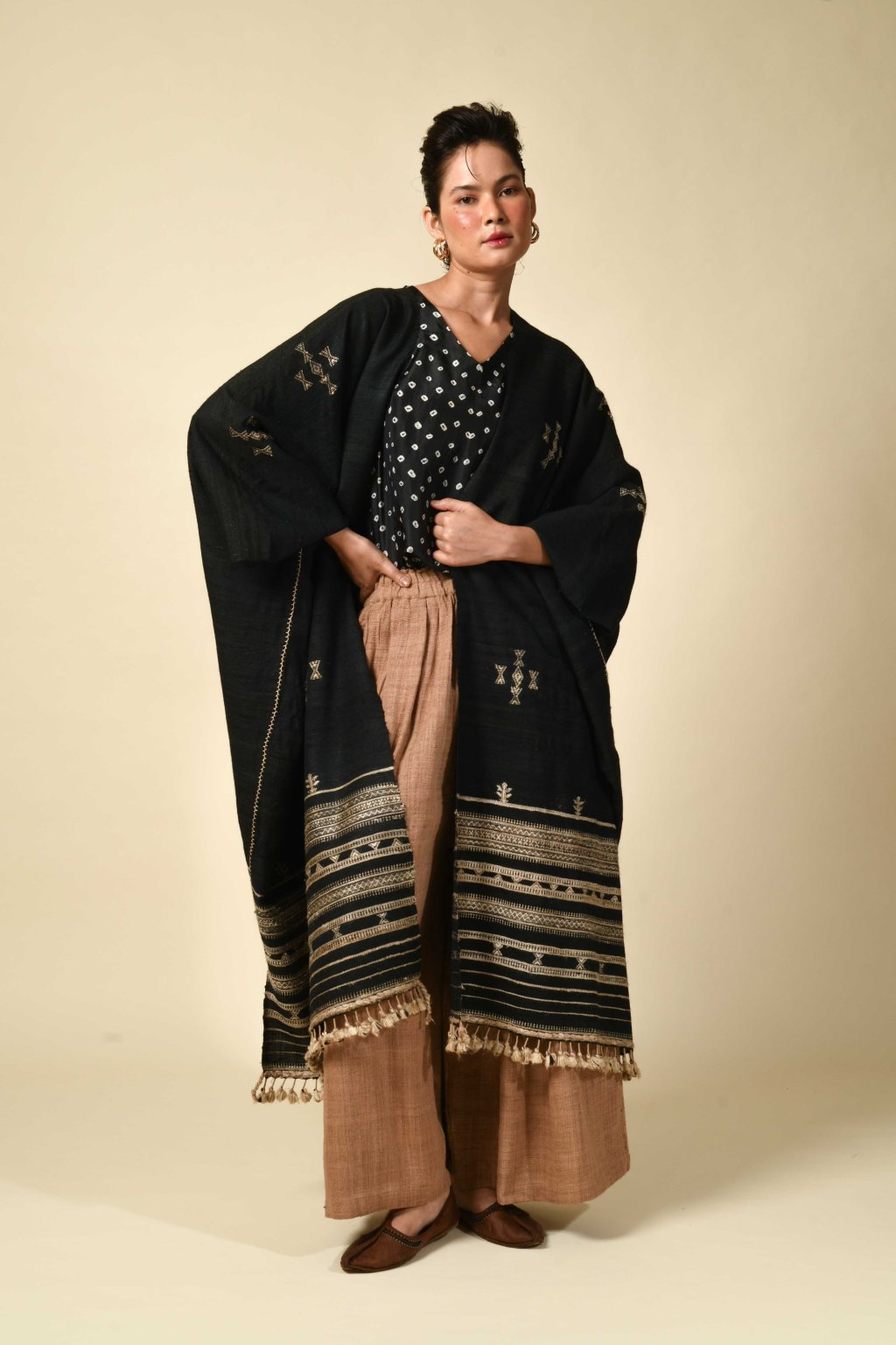 Tato kolekce, formovaná vyprahlou krajinou regionu Kutch, má své kořeny v pasteveckém životě, kde byla vlna odjakživa nezbytná pro teplo, ochranu a odolnost. Tyto textilie, stvořené spíše pro pohyb než na odiv, vzešly z nutnosti, nikoli z touhy po zdobnosti. Látka, kterou v Kutchi utkal Rajan Bhimji Vankar, řemeslník čtvrté generace, si v sobě nese staletou rodovou linii. Motivy doplňkového útku jsou vkládány ručně přímo na tkalcovském stavu, což dodává látce hloubku a zároveň zachovává její celistvost. Siluety se řídí pouštní logikou: jsou velkorysé, plošné a přizpůsobivé. Minimální střih, maximální plocha: umožňují vláknu, struktuře a vzoru promlouvat, aniž by byly něčím rušeny. Jsou to kousky, po kterých sáhnete bez zbytečných obřadností. Mají v sobě nenucenou přítomnost a dávají smysl při každodenním nošení, při změnách i opakování. Zemité tóny a klidná geometrie definují pouštní estetiku, která je ukotvená, zdrženlivá a trvalá. V dialogu s Talismanem tato kolekce rozšiřuje myšlenku dědictví na látku formovanou pohybem, místem a časem.