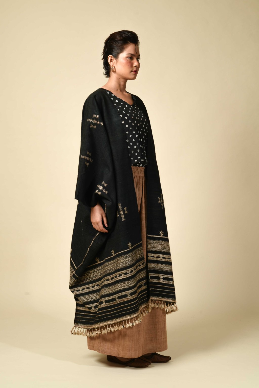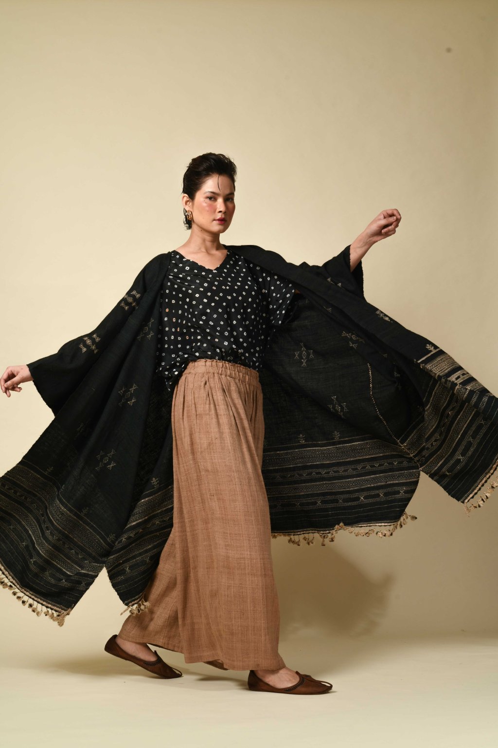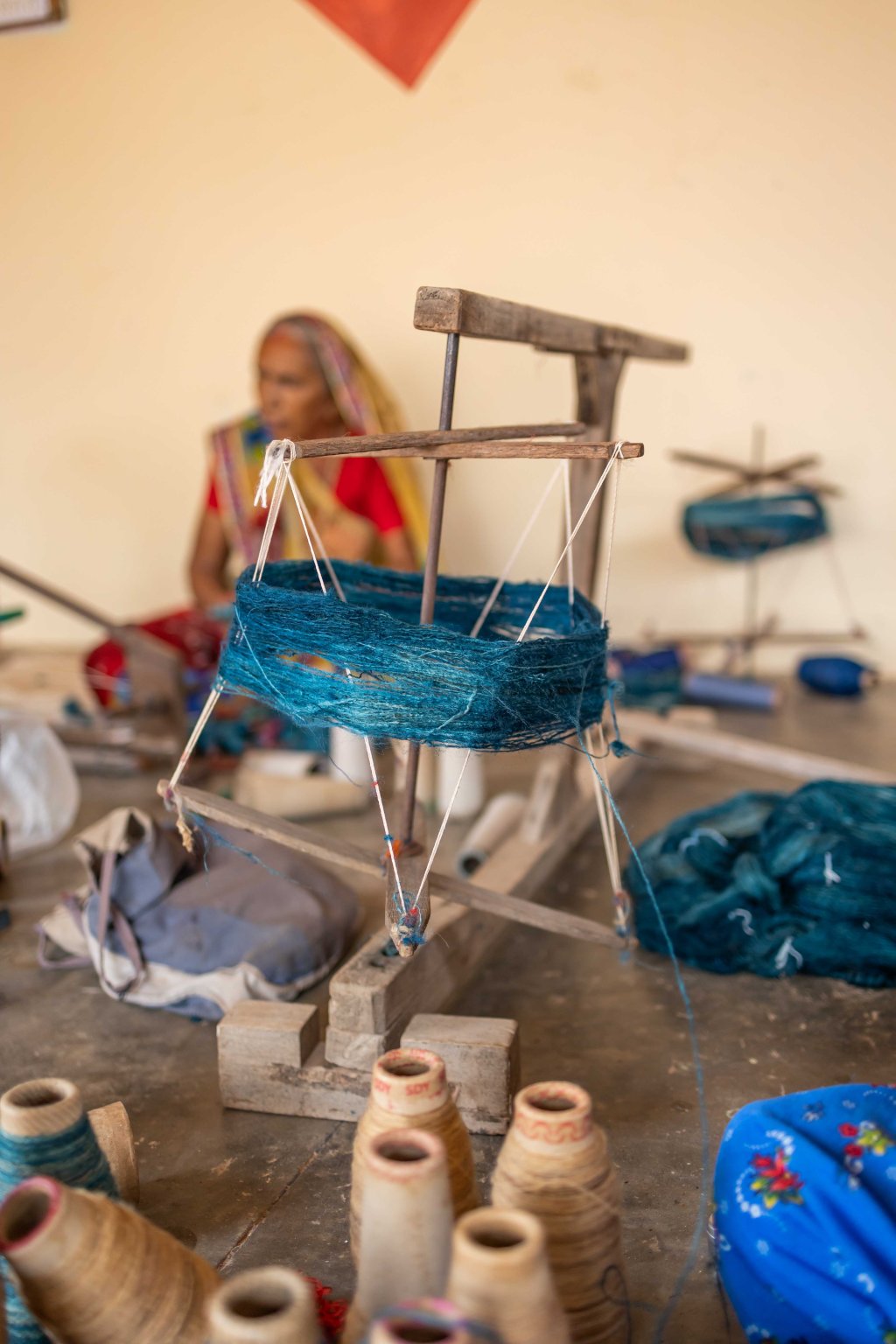 Rajanova paleta barev čerpá přímo ze země: tlumené hnědé odstíny pouště, chladné indigo, teplé tóny přírodní červeně. Pracuje s řadou výjimečných vláken – od lokální vlny Desi a jemné vlny Merino, přes ručně spřádané hedvábí Tussar a Eri, až po původní bavlnu Kala. Do každého kusu tak vnáší dokonalou rovnováhu měkkosti a síly.