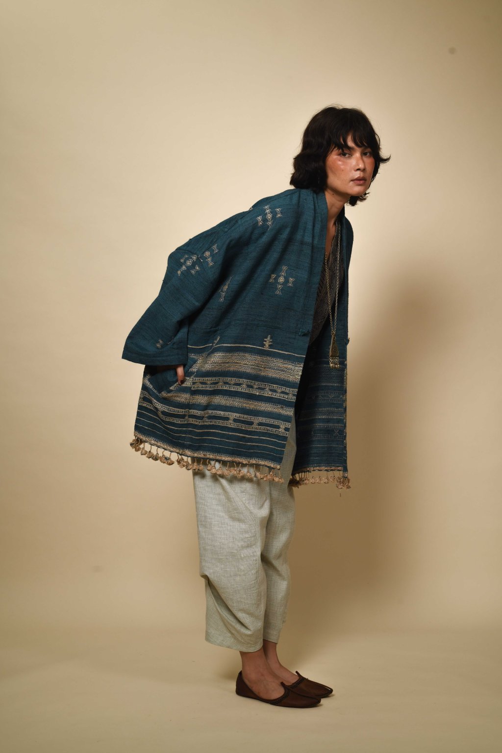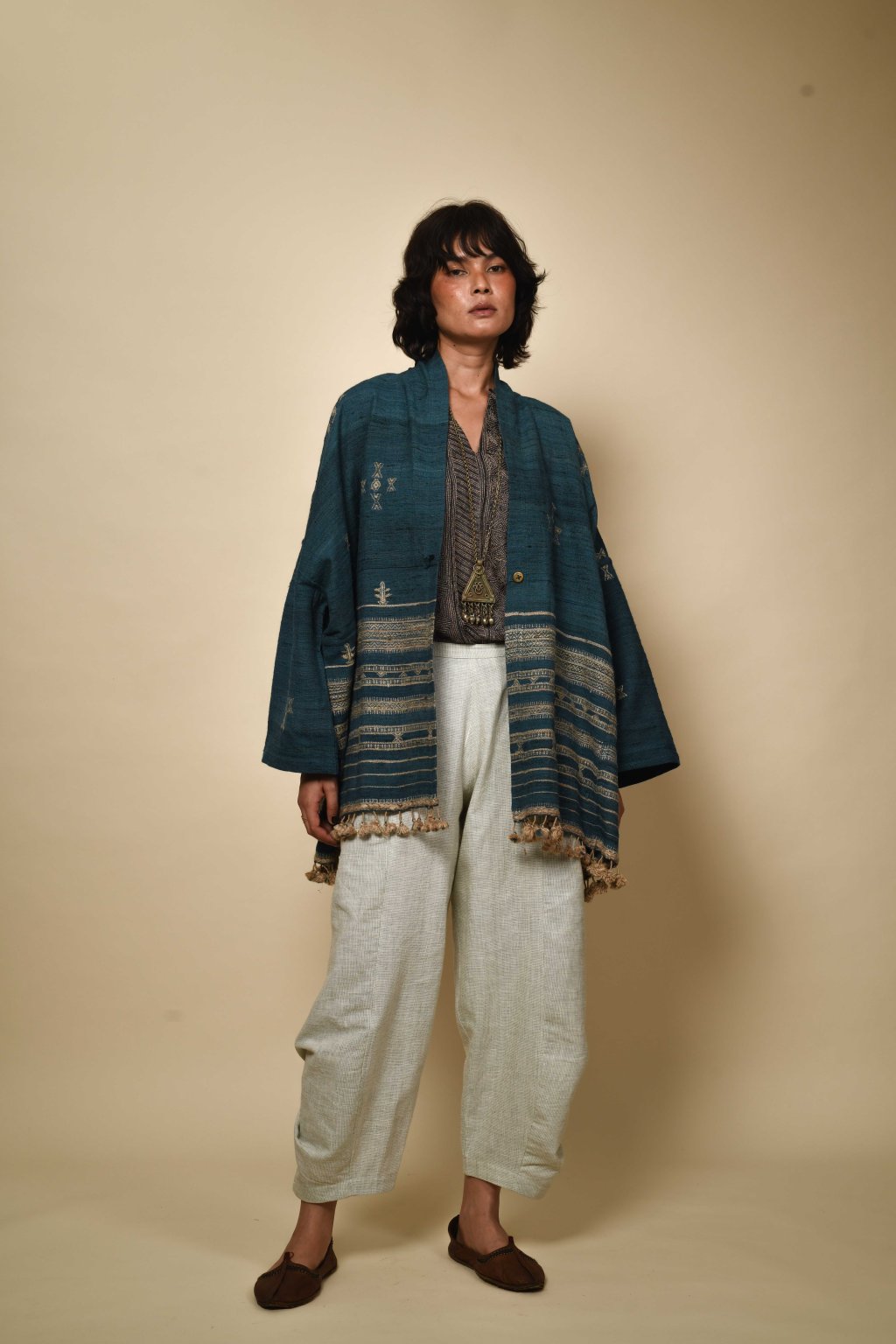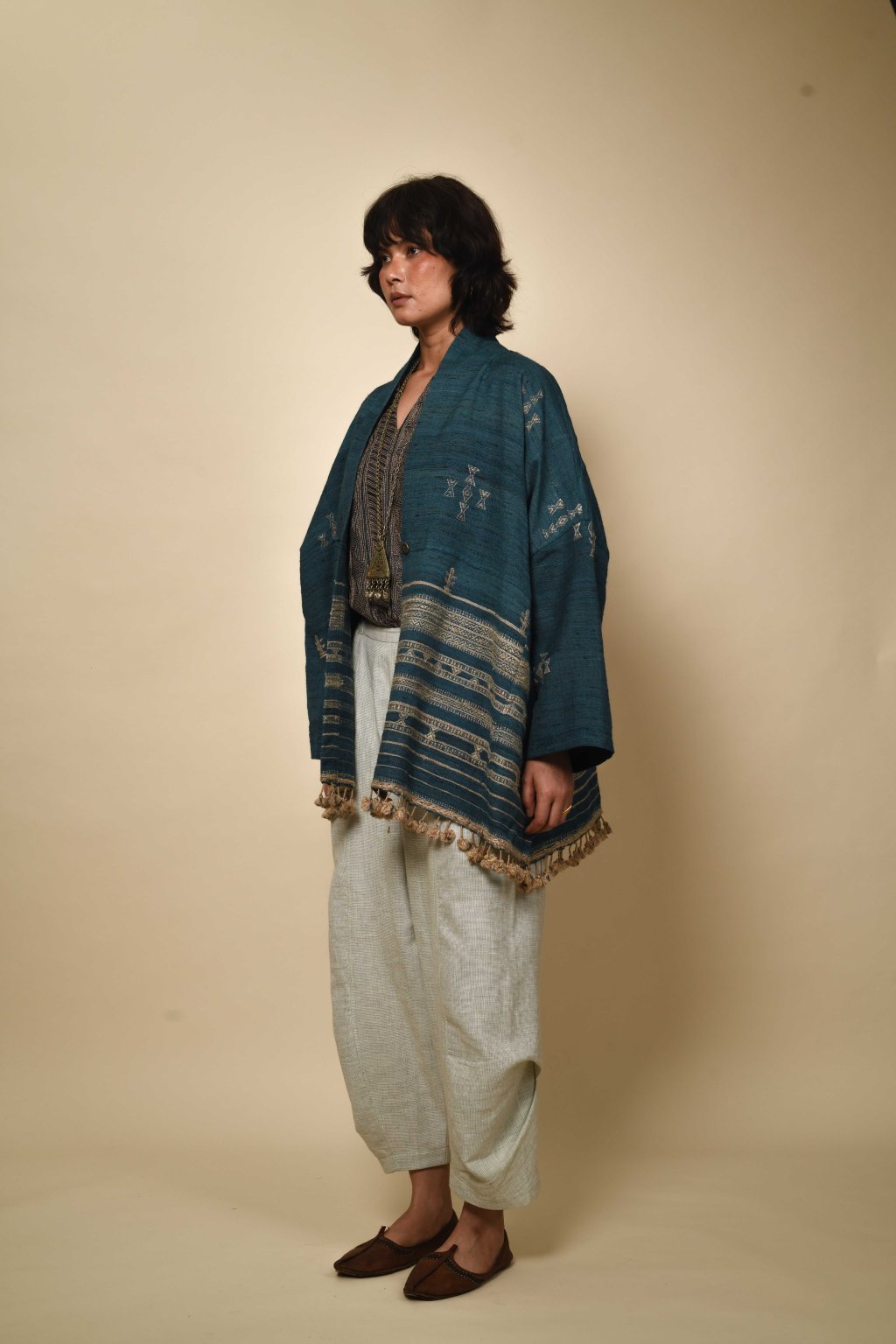 Rajanova paleta čerpá ze země: tlumené pouštní hnědé, chladivé indigové i hřejivé tóny mořeny. Pracuje s řadou výjimečných vláken – s místní vlnou Desi a jemnou merino vlnou, s ručně předeným hedvábím Tussar a Eri i domorodou bavlnou Kala – a vnáší do každého kusu měkkost a sílu.