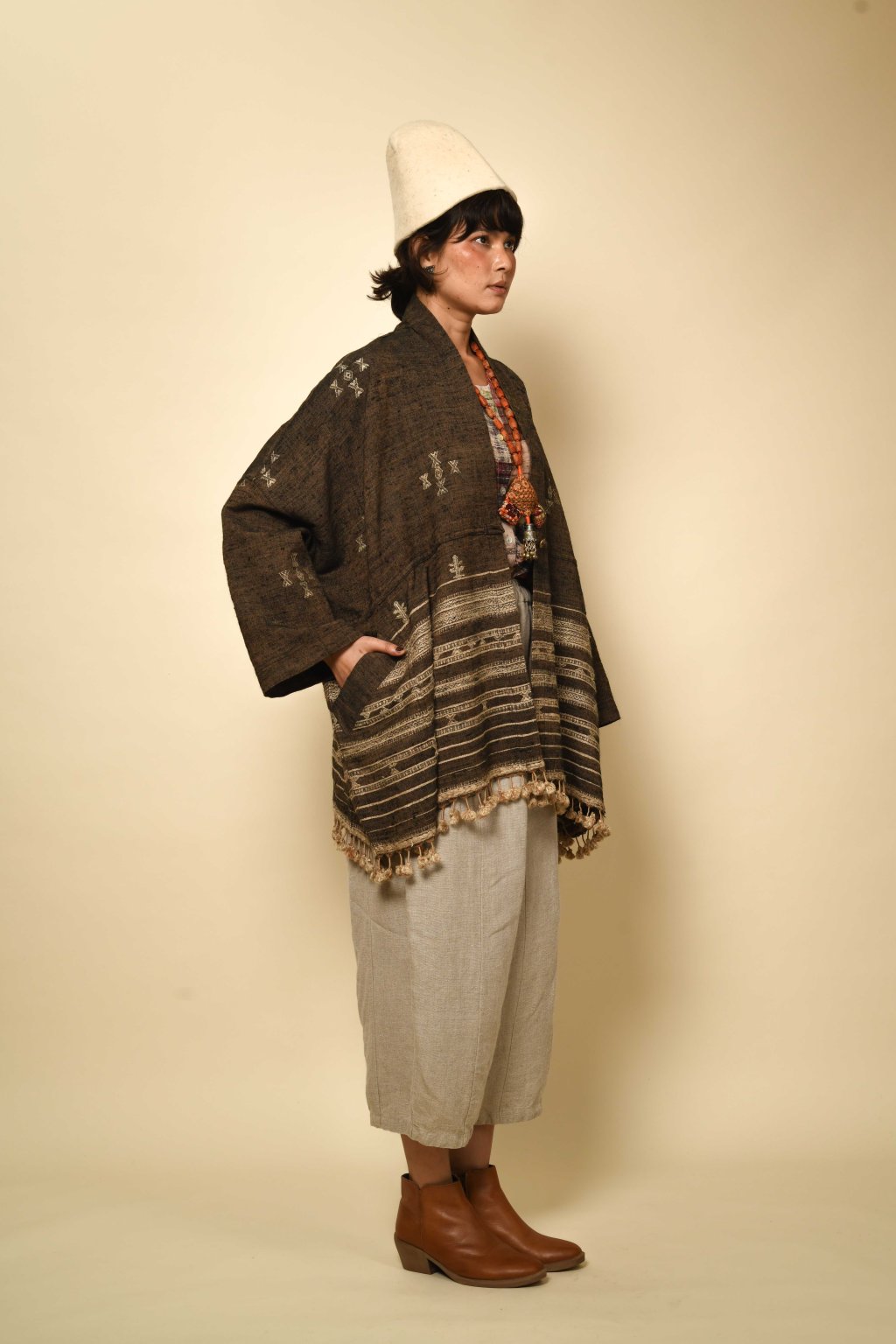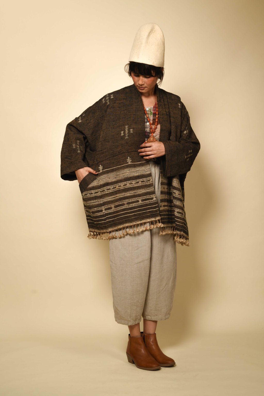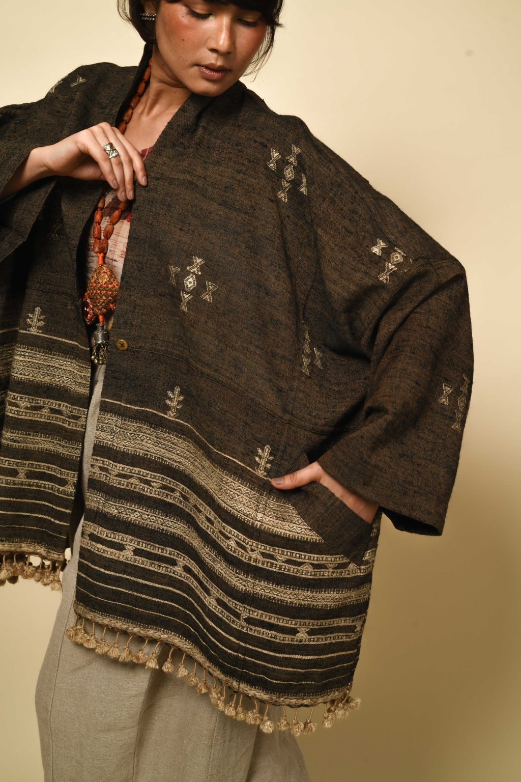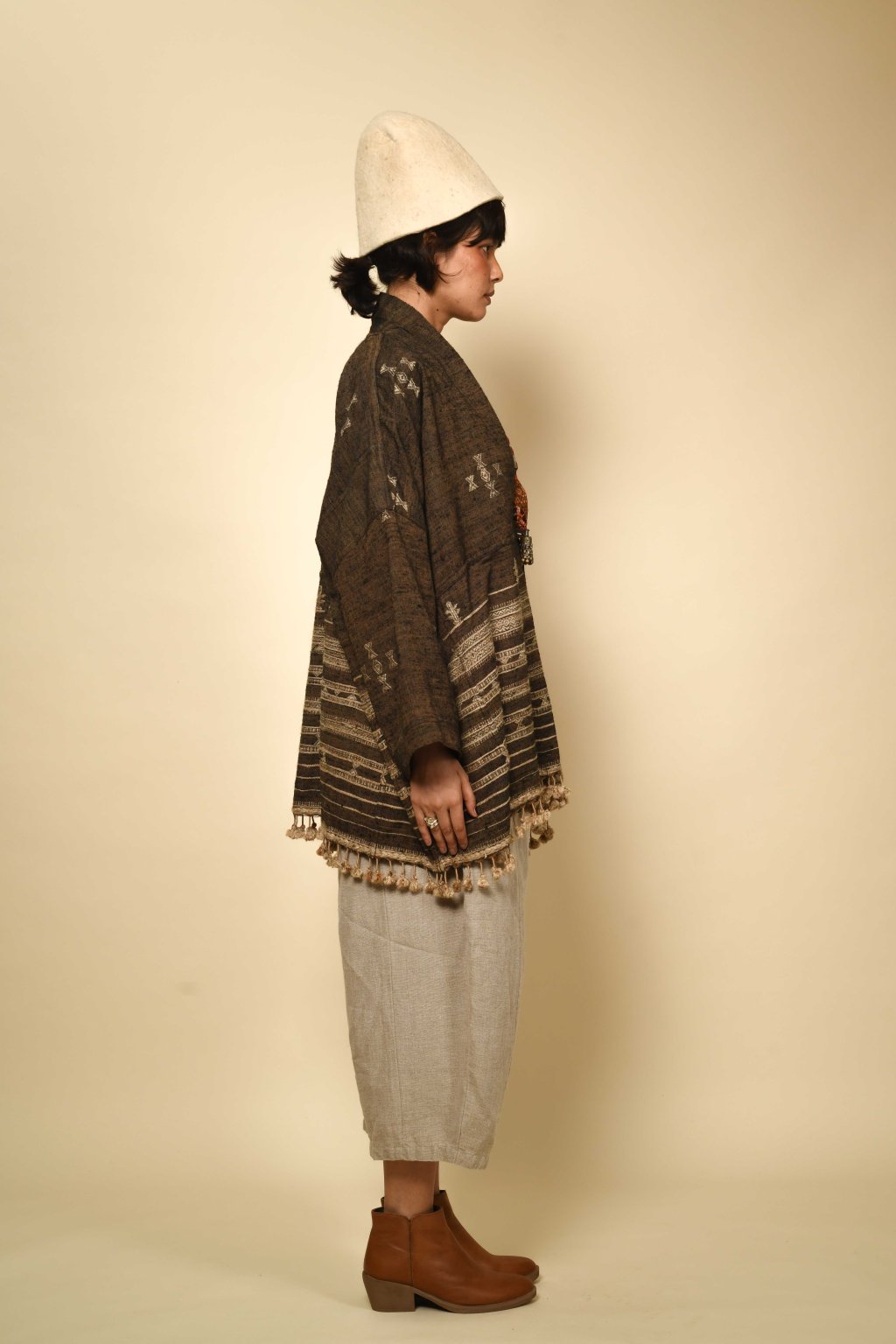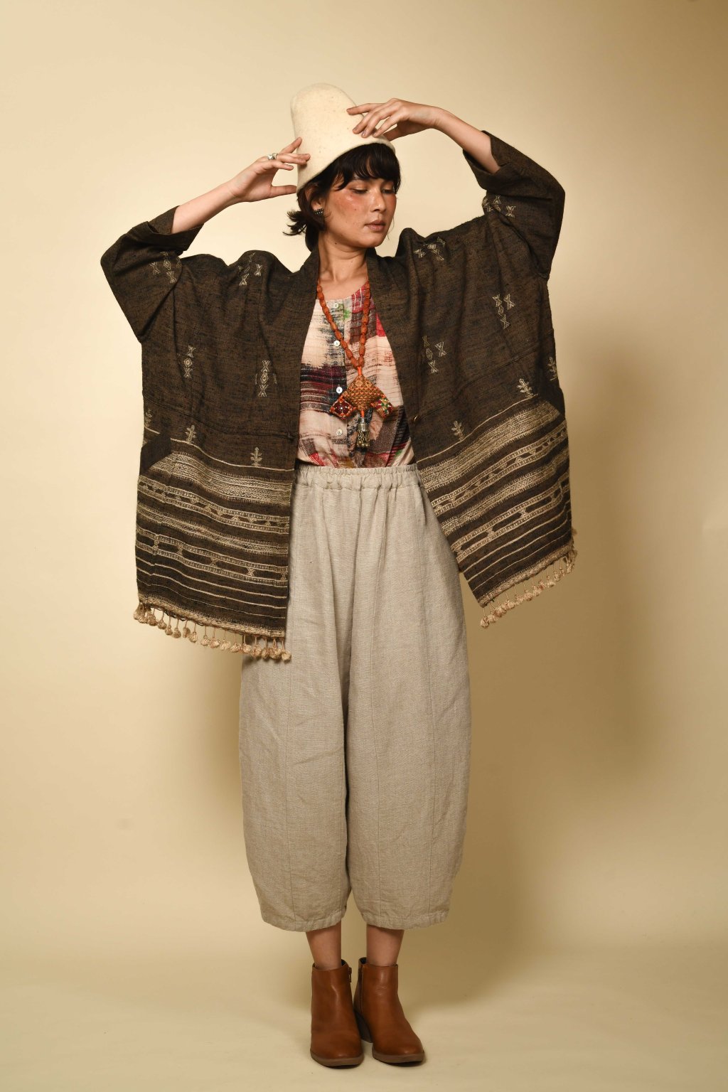Tato kolekce, formovaná vyprahlou krajinou regionu Kutch, má své kořeny v pasteveckém životě, kde byla vlna odjakživa nezbytná pro teplo, ochranu a odolnost. Tyto textilie, stvořené spíše pro pohyb než na odiv, vzešly z nutnosti, nikoli z touhy po zdobnosti. Látka, kterou v Kutchi utkal Rajan Bhimji Vankar, řemeslník čtvrté generace, si v sobě nese staletou rodovou linii. Motivy doplňkového útku jsou vkládány ručně přímo na tkalcovském stavu, což dodává látce hloubku a zároveň zachovává její celistvost. Siluety se řídí pouštní logikou: jsou velkorysé, plošné a přizpůsobivé. Minimální střih, maximální plocha: umožňují vláknu, struktuře a vzoru promlouvat, aniž by byly něčím rušeny. Jsou to kousky, po kterých sáhnete bez zbytečných obřadností. Mají v sobě nenucenou přítomnost a dávají smysl při každodenním nošení, při změnách i opakování. Zemité tóny a klidná geometrie definují pouštní estetiku, která je ukotvená, zdrženlivá a trvalá. V dialogu s Talismanem tato kolekce rozšiřuje myšlenku dědictví na látku formovanou pohybem, místem a časem.