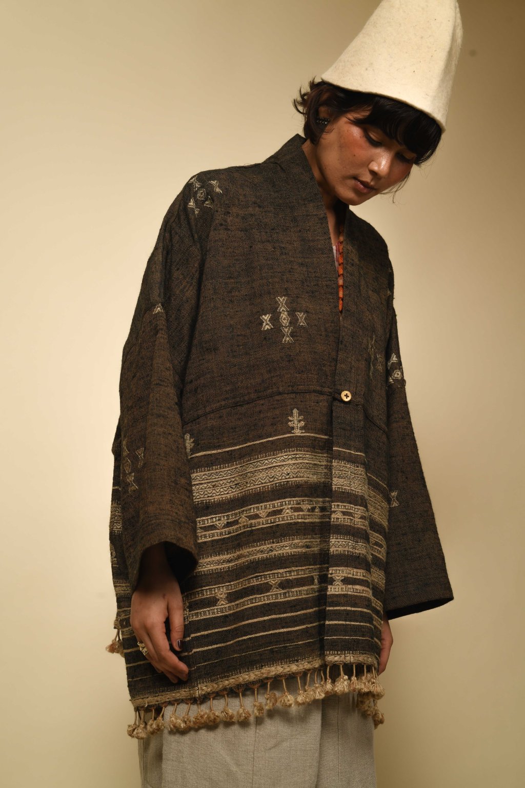 Rajanova paleta čerpá ze země: tlumené pouštní hnědé, chladné indigové a teplé mořenové tóny. Pracuje s řadou výjimečných vláken – lokální vlnou Desi a jemnou Merino vlnou, ručně předeným hedvábím Tussar a Eri a domorodou bavlnou Kala – čímž do každého kusu vnáší měkkost a sílu.
