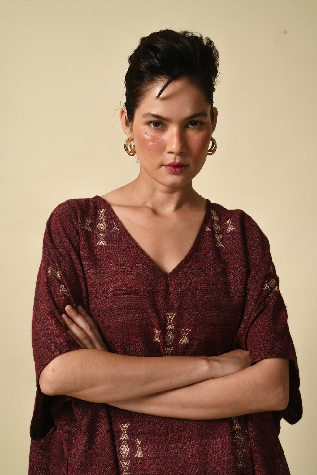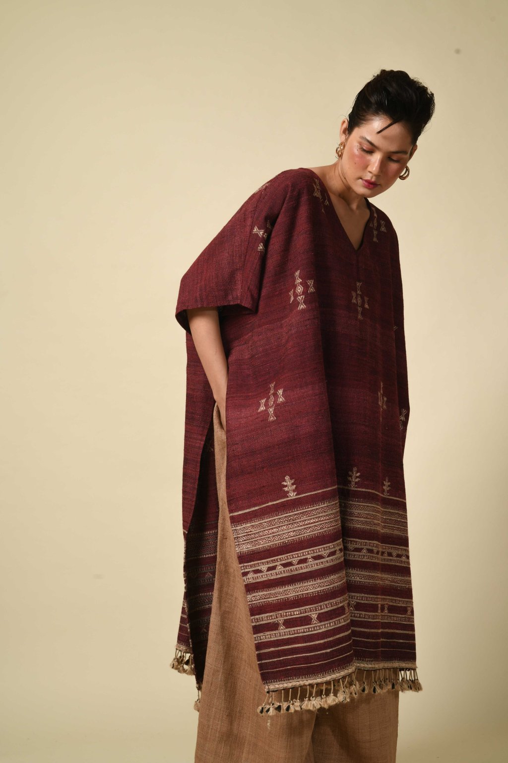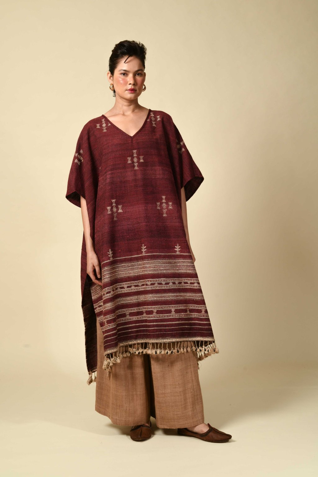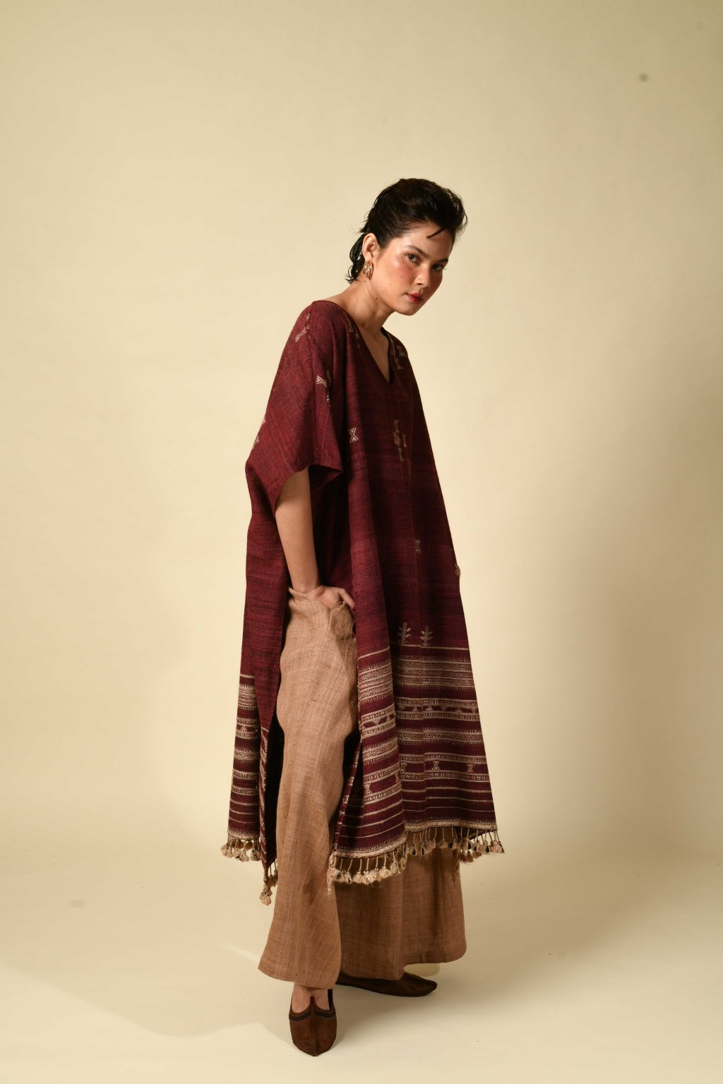 Rajanova paleta čerpá ze země: tlumené pouštní hnědé, chladné indigové a teplé mořenové tóny. Pracuje s řadou výjimečných vláken – od místní vlny Desi a jemné merino vlny, přes ručně předené hedvábí Tussar a Eri, až po domorodou bavlnu Kala. Do každého kousku tak vnáší dokonalou harmonii měkkosti a pevnosti.