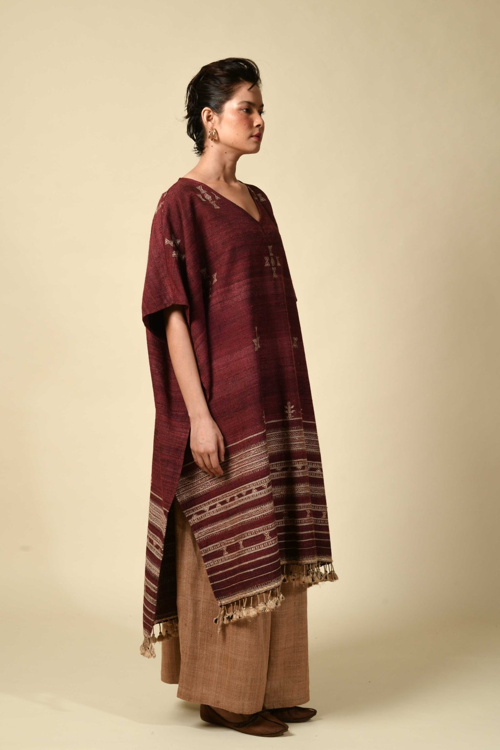 Tato kolekce, formovaná vyprahlou krajinou regionu Kutch, má své kořeny v pasteveckém životě, kde byla vlna odjakživa nezbytná pro teplo, ochranu a odolnost. Tyto textilie, stvořené spíše pro pohyb než na odiv, vzešly z nutnosti, nikoli z touhy po zdobnosti. Látka, kterou v Kutchi utkal Rajan Bhimji Vankar, řemeslník čtvrté generace, si v sobě nese staletou rodovou linii. Motivy doplňkového útku jsou vkládány ručně přímo na tkalcovském stavu, což dodává látce hloubku a zároveň zachovává její celistvost. Siluety se řídí pouštní logikou: jsou velkorysé, plošné a přizpůsobivé. Minimální střih, maximální plocha: umožňují vláknu, struktuře a vzoru promlouvat, aniž by byly něčím rušeny. Jsou to kousky, po kterých sáhnete bez zbytečných obřadností. Mají v sobě nenucenou přítomnost a dávají smysl při každodenním nošení, při změnách i opakování. Zemité tóny a klidná geometrie definují pouštní estetiku, která je ukotvená, zdrženlivá a trvalá. V dialogu s Talismanem tato kolekce rozšiřuje myšlenku dědictví na látku formovanou pohybem, místem a časem.