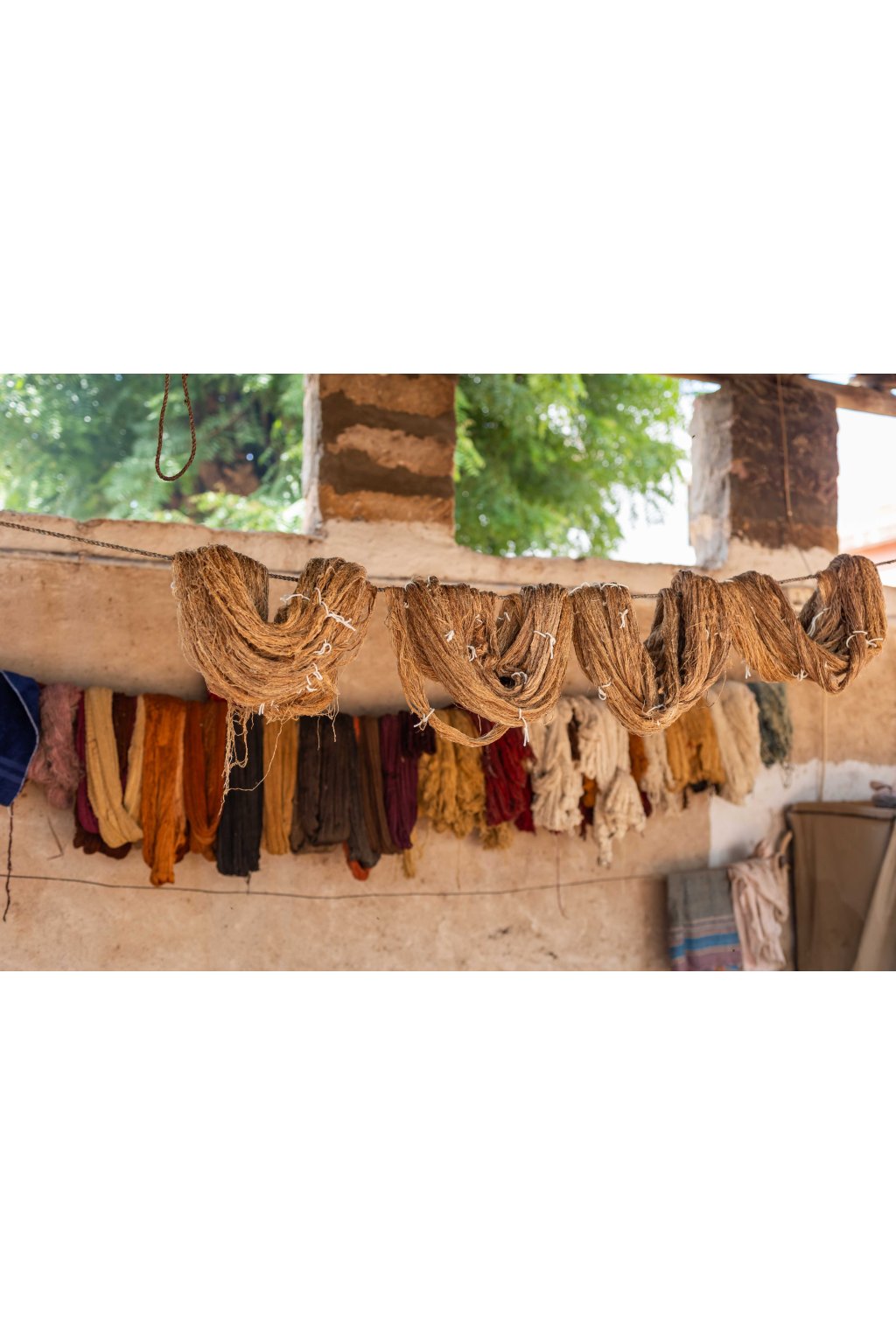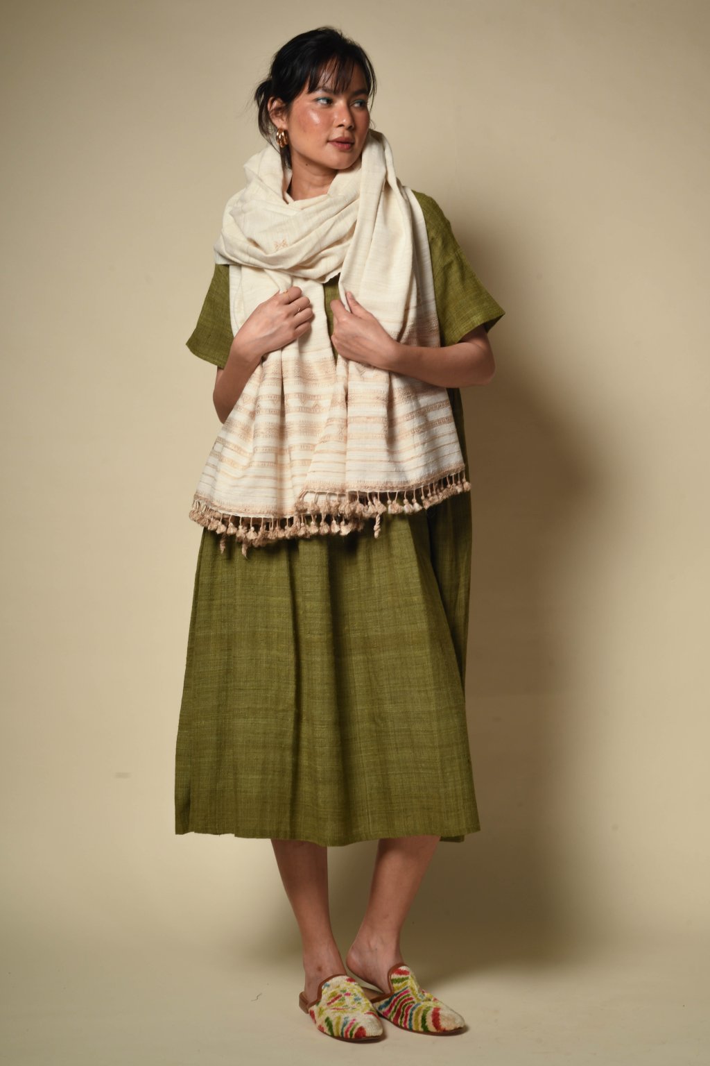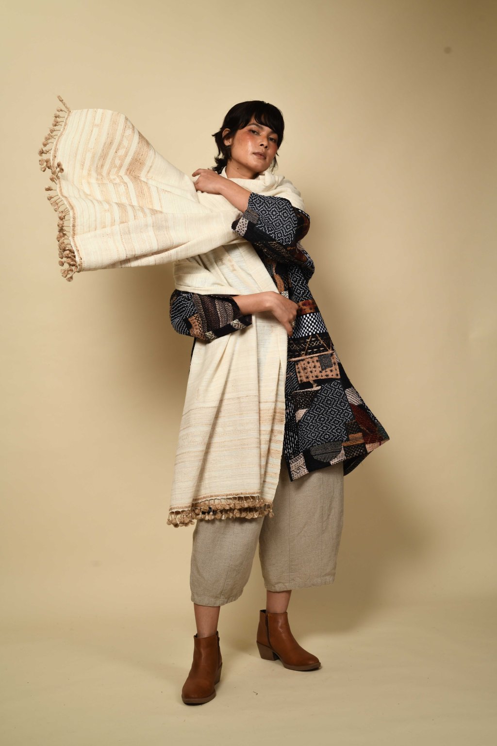 Rajanovy šály, štóly, plédy a přikrývky čerpají inspiraci ze země i z oblohy: najdete v nich tlumené pouštní hnědé tóny, chladivé indigo, záblesky sytě růžové, a dokonce i téměř neonově oranžové barvy. Pracuje s paletou výjimečných vláken – od místní vlny Desi a jemné vlny Merino, přes ručně předené hedvábí Tussar a Eri, až po původní bavlnu Kala. Do každého kousku tak vnáší nezaměnitelnou měkkost i pevnost.