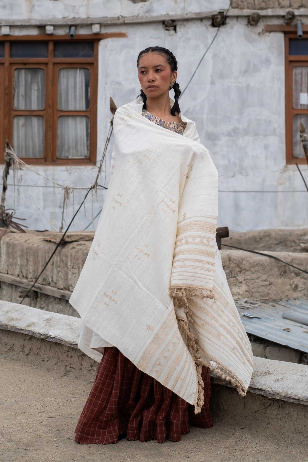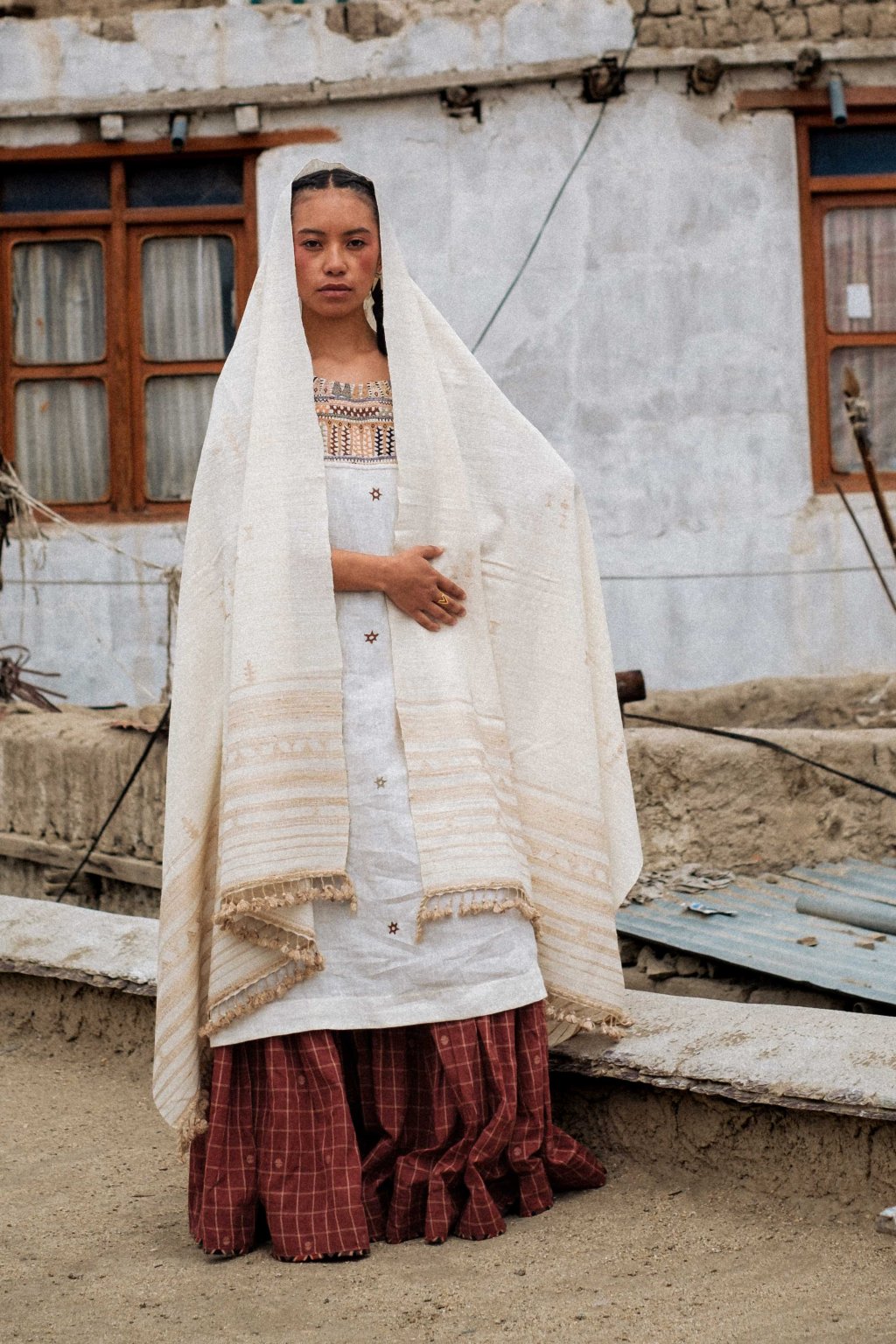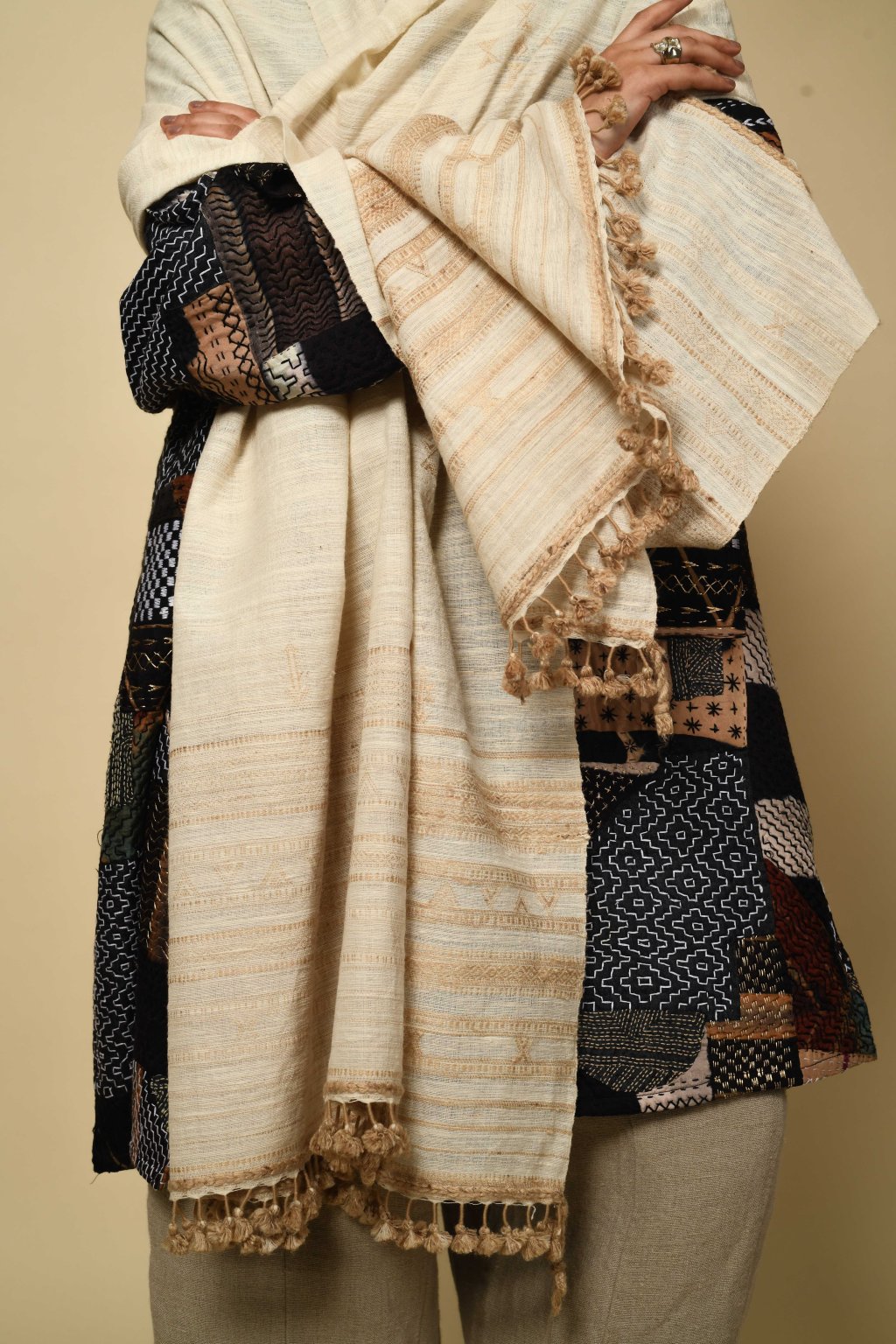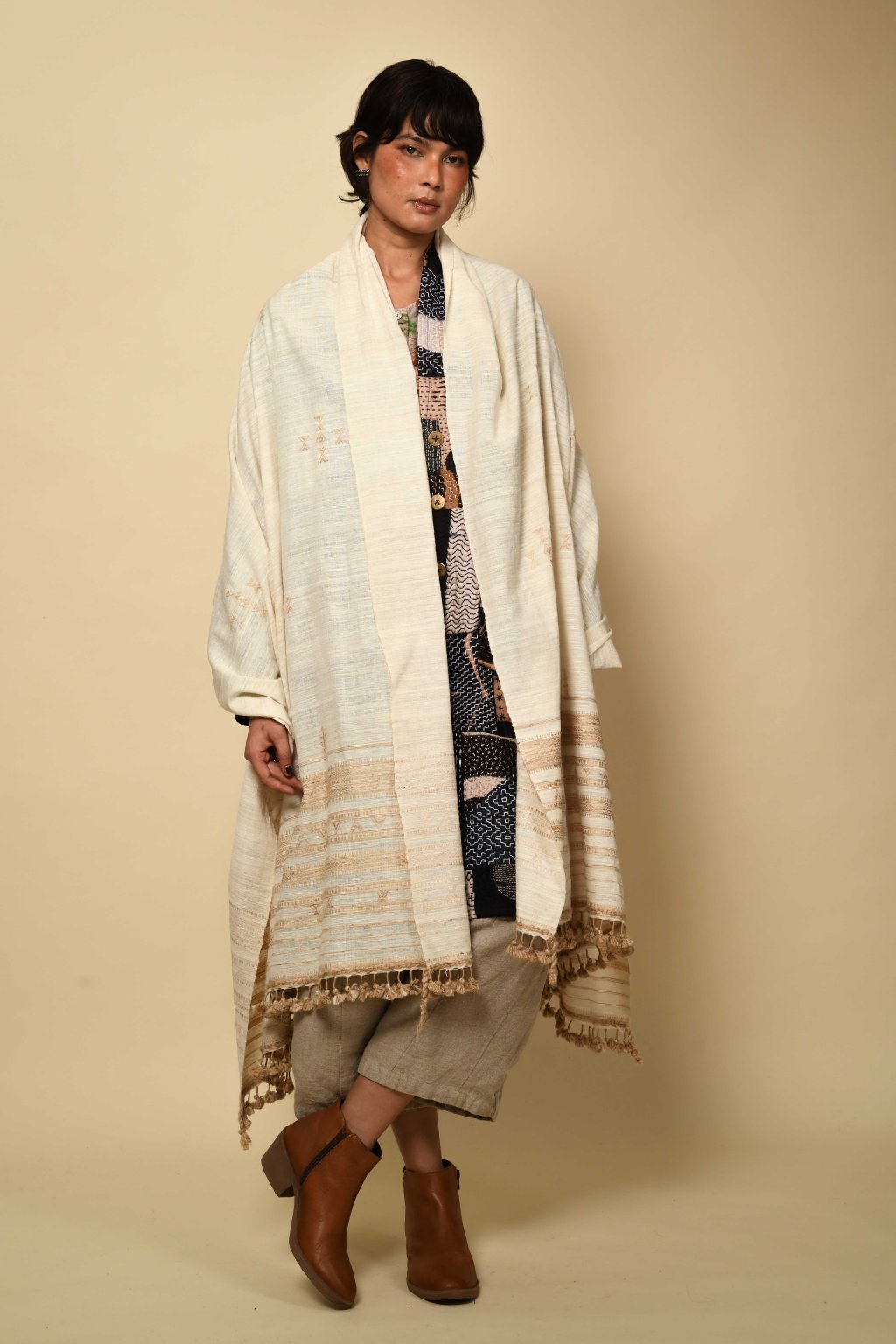 Tato kolekce, formovaná vyprahlou krajinou regionu Kutch, má své kořeny v pasteveckém životě, kde byla vlna odjakživa nezbytná pro teplo, ochranu a odolnost. Tyto textilie, stvořené spíše pro pohyb než na odiv, vzešly z nutnosti, nikoli z touhy po zdobnosti. Látka, kterou v Kutchi utkal Rajan Bhimji Vankar, řemeslník čtvrté generace, si v sobě nese staletou rodovou linii. Motivy doplňkového útku jsou vkládány ručně přímo na tkalcovském stavu, což dodává látce hloubku a zároveň zachovává její celistvost. Siluety se řídí pouštní logikou: jsou velkorysé, plošné a přizpůsobivé. Minimální střih, maximální plocha: umožňují vláknu, struktuře a vzoru promlouvat, aniž by byly něčím rušeny. Jsou to kousky, po kterých sáhnete bez zbytečných obřadností. Mají v sobě nenucenou přítomnost a dávají smysl při každodenním nošení, při změnách i opakování. Zemité tóny a klidná geometrie definují pouštní estetiku, která je ukotvená, zdrženlivá a trvalá. V dialogu s Talismanem tato kolekce rozšiřuje myšlenku dědictví na látku formovanou pohybem, místem a časem.