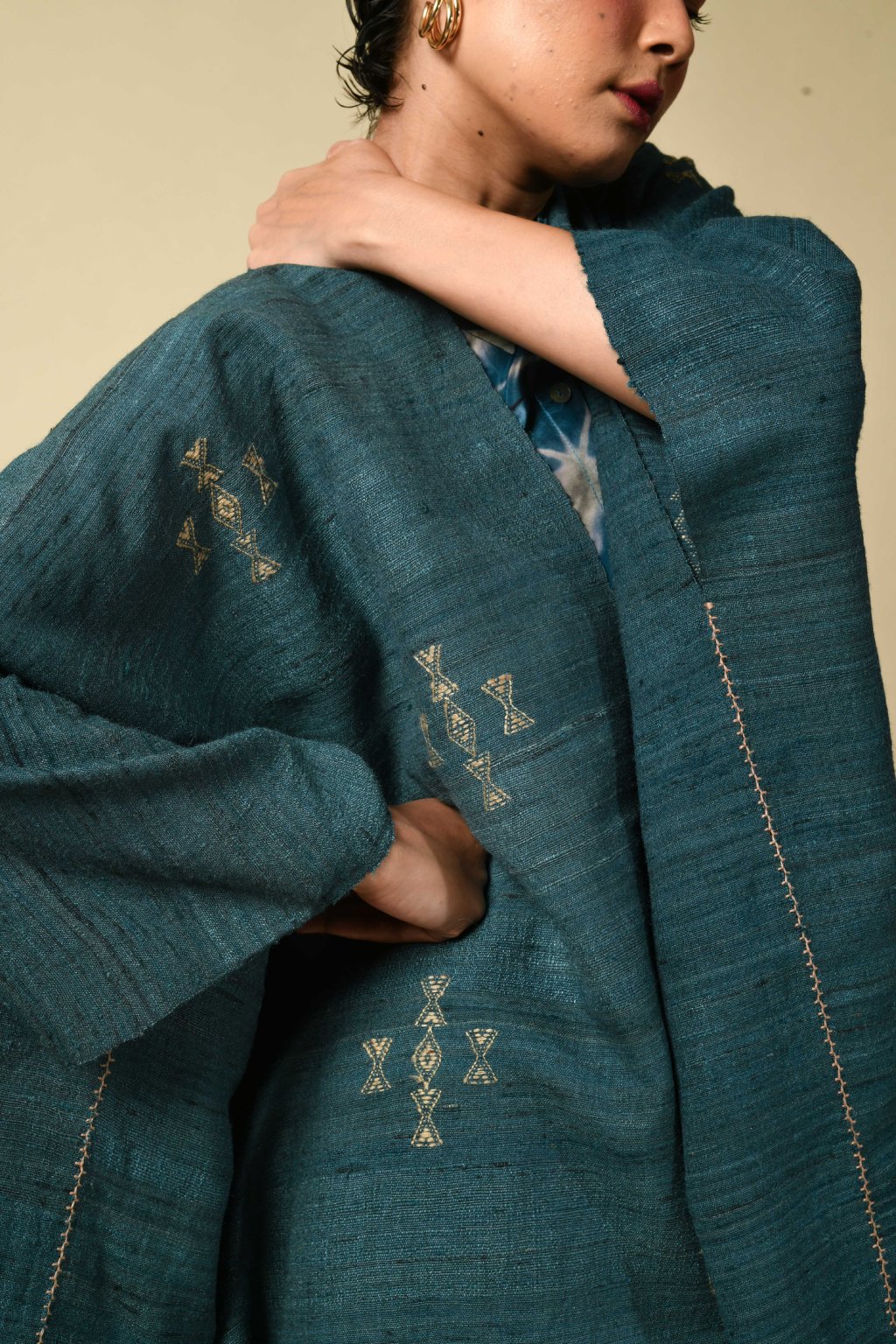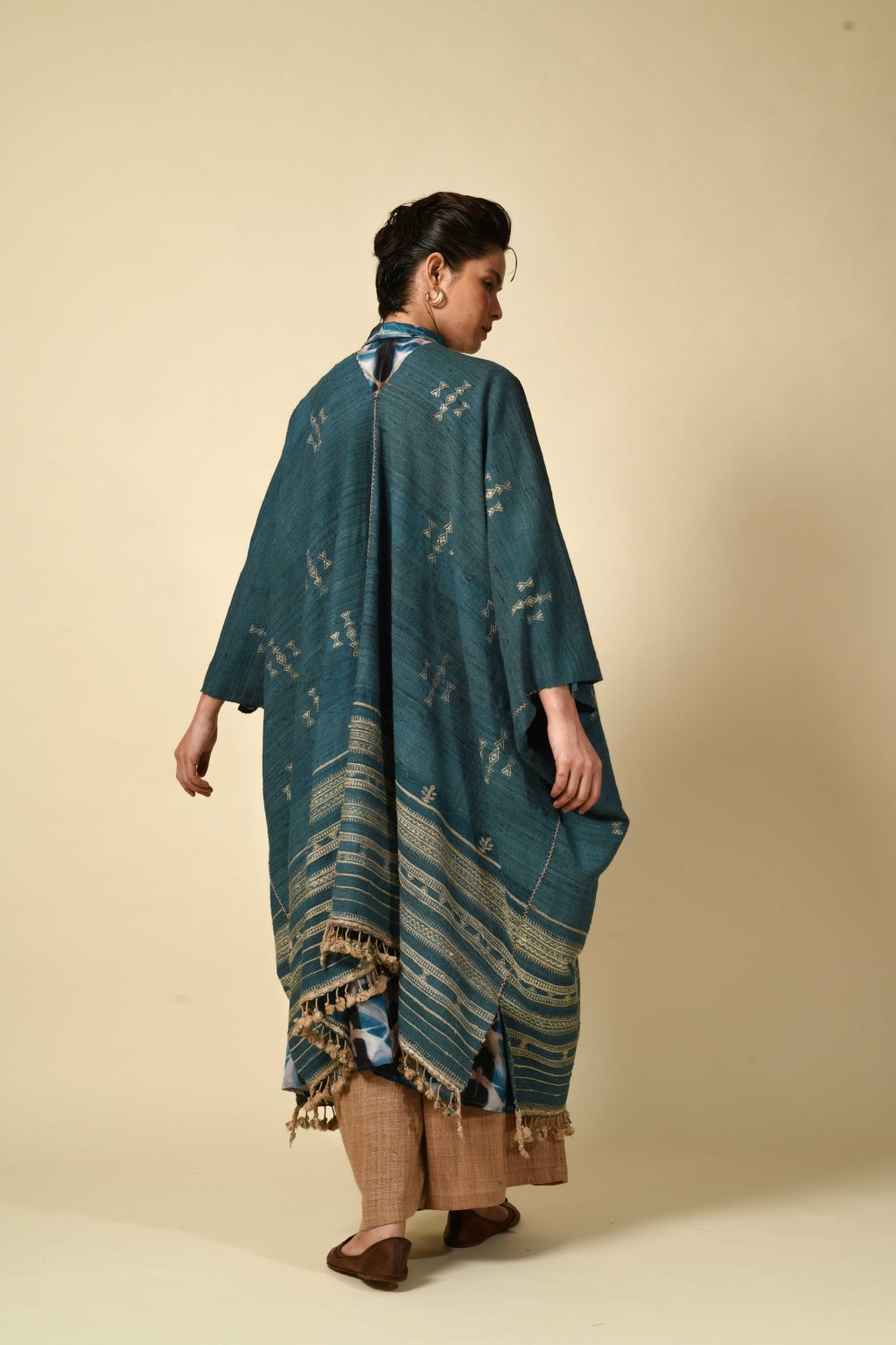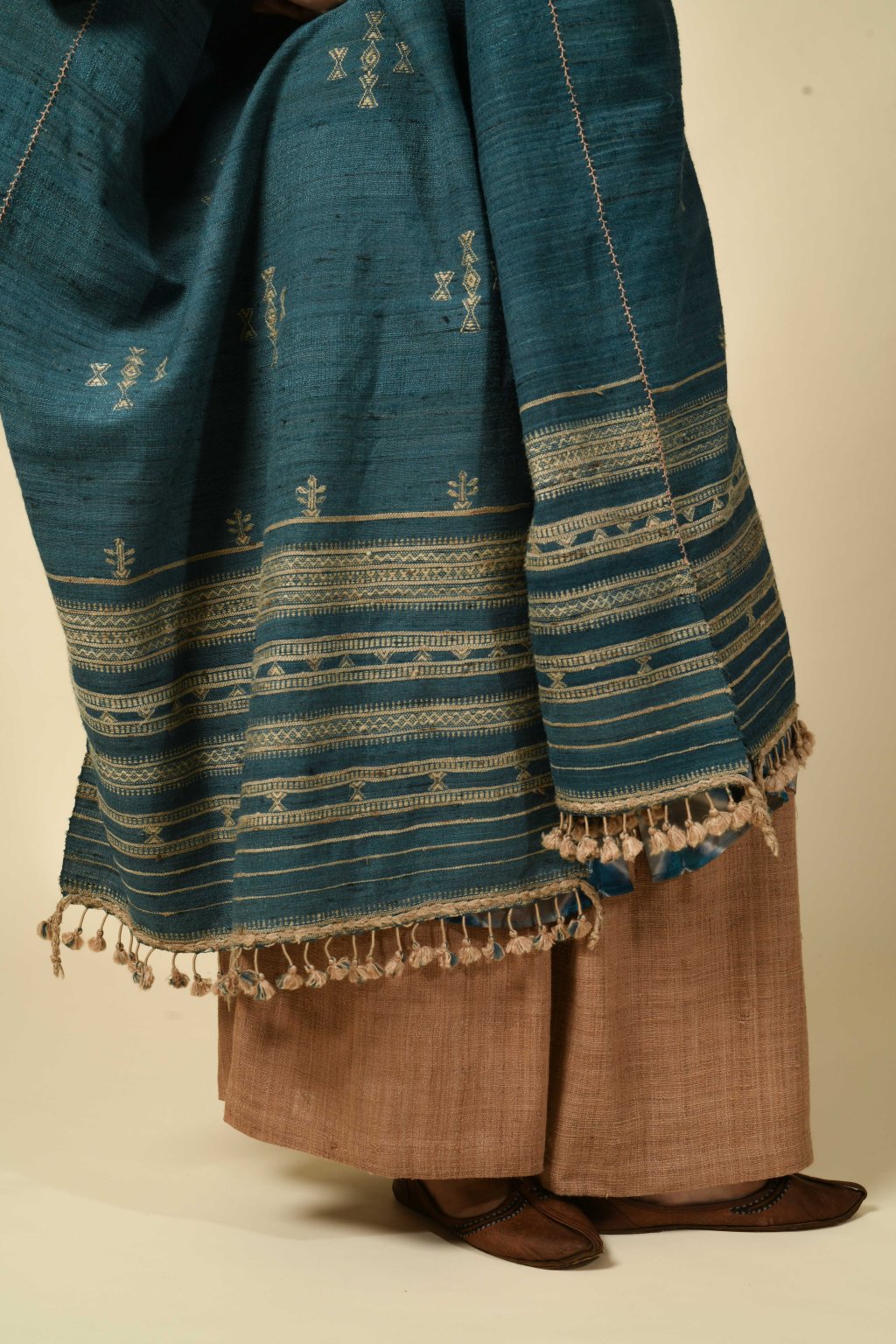 Tato kolekce, formovaná vyprahlou krajinou regionu Kutch, má své kořeny v pasteveckém životě, kde byla vlna odjakživa nezbytná pro teplo, ochranu a odolnost. Tyto textilie, stvořené spíše pro pohyb než na odiv, vzešly z nutnosti, nikoli z touhy po zdobnosti. Látka, kterou v Kutchi utkal Rajan Bhimji Vankar, řemeslník čtvrté generace, si v sobě nese staletou rodovou linii. Motivy doplňkového útku jsou vkládány ručně přímo na tkalcovském stavu, což dodává látce hloubku a zároveň zachovává její celistvost. Siluety se řídí pouštní logikou: jsou velkorysé, plošné a přizpůsobivé. Minimální střih, maximální plocha: umožňují vláknu, struktuře a vzoru promlouvat, aniž by byly něčím rušeny. Jsou to kousky, po kterých sáhnete bez zbytečných obřadností. Mají v sobě nenucenou přítomnost a dávají smysl při každodenním nošení, při změnách i opakování. Zemité tóny a klidná geometrie definují pouštní estetiku, která je ukotvená, zdrženlivá a trvalá. V dialogu s Talismanem tato kolekce rozšiřuje myšlenku dědictví na látku formovanou pohybem, místem a časem.