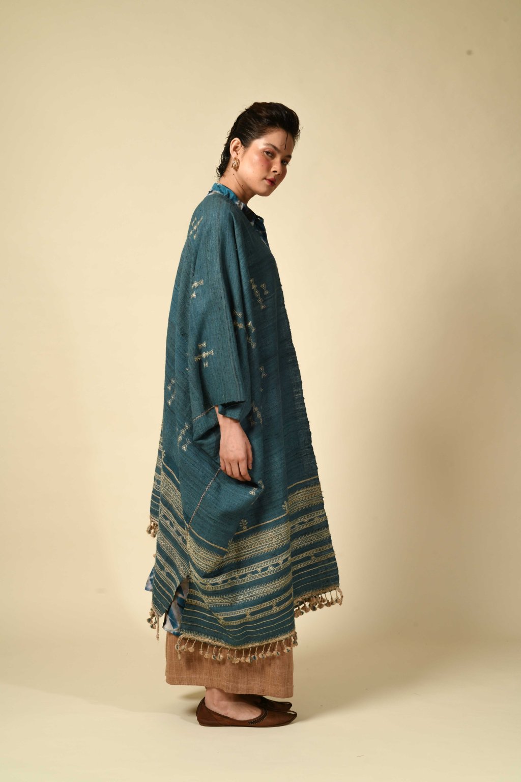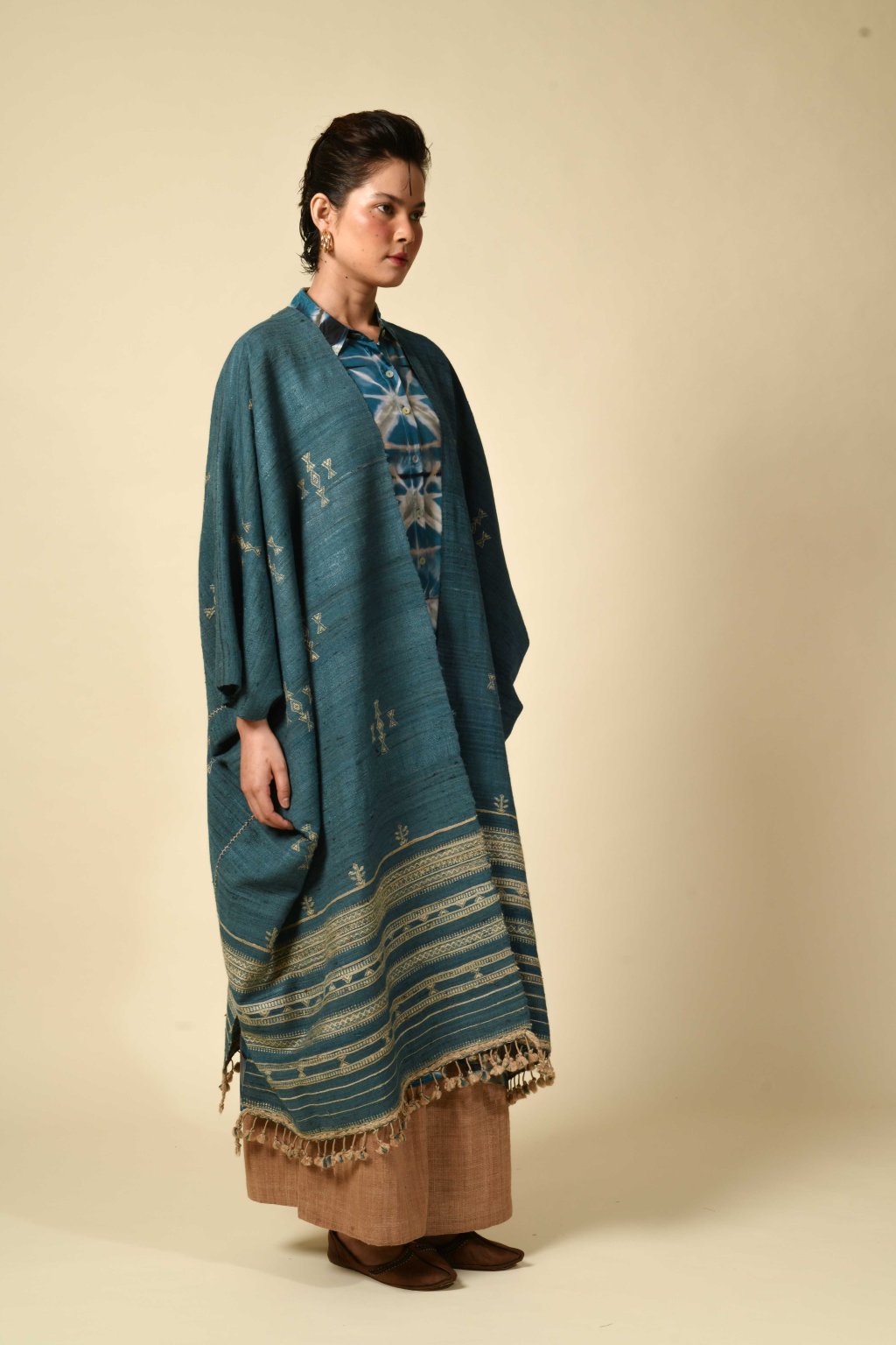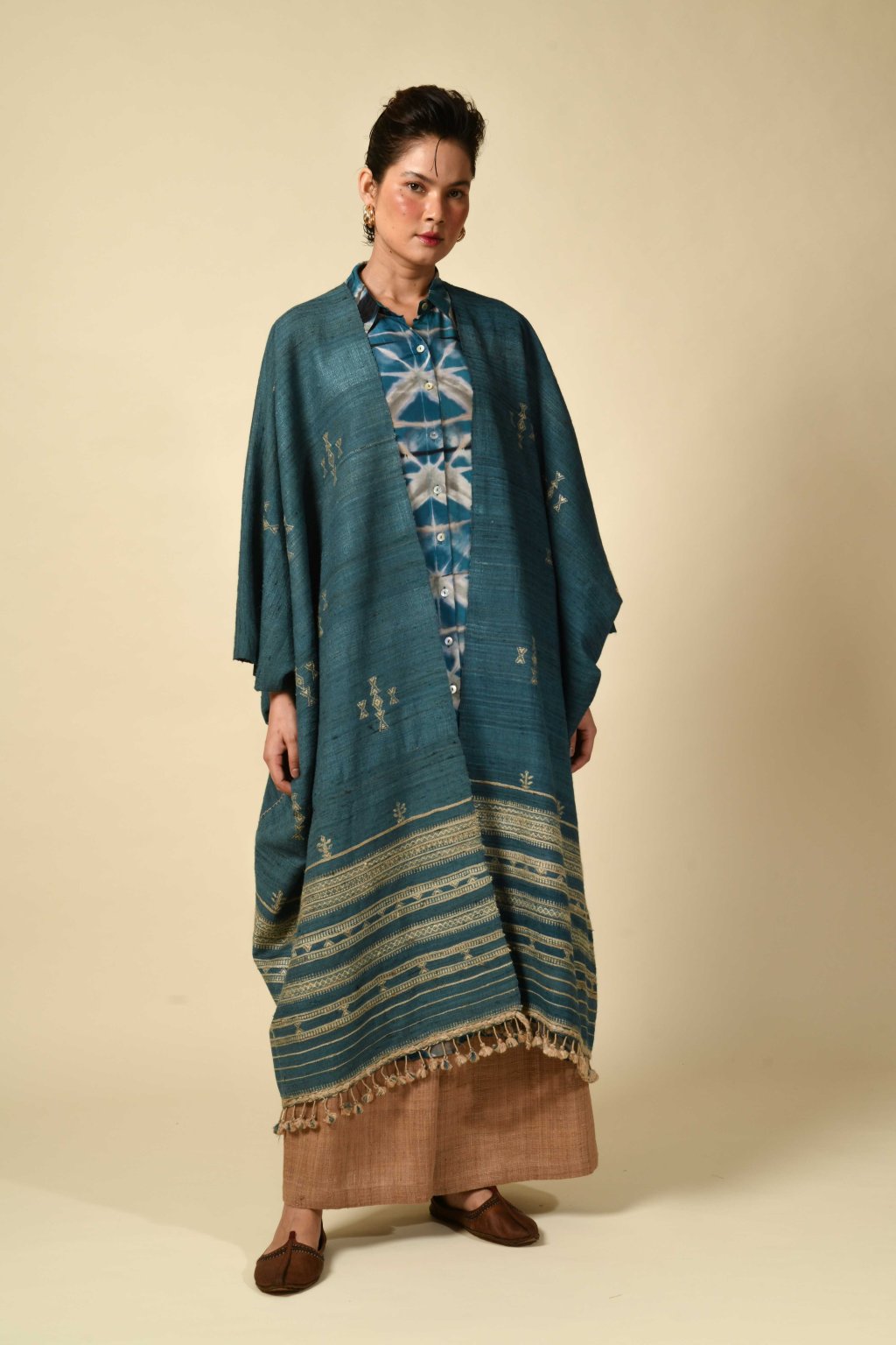 Rajanova paleta čerpá ze země: tlumené pouštní hnědé, chladné indigo, hřejivá mořena. Pracuje s řadou výjimečných vláken – lokální vlnou Desi a jemnou Merino vlnou, ručně předeným hedvábím Tussar a Eri nebo domorodou bavlnou Kala – čímž do každého kousku vnáší měkkost i sílu.